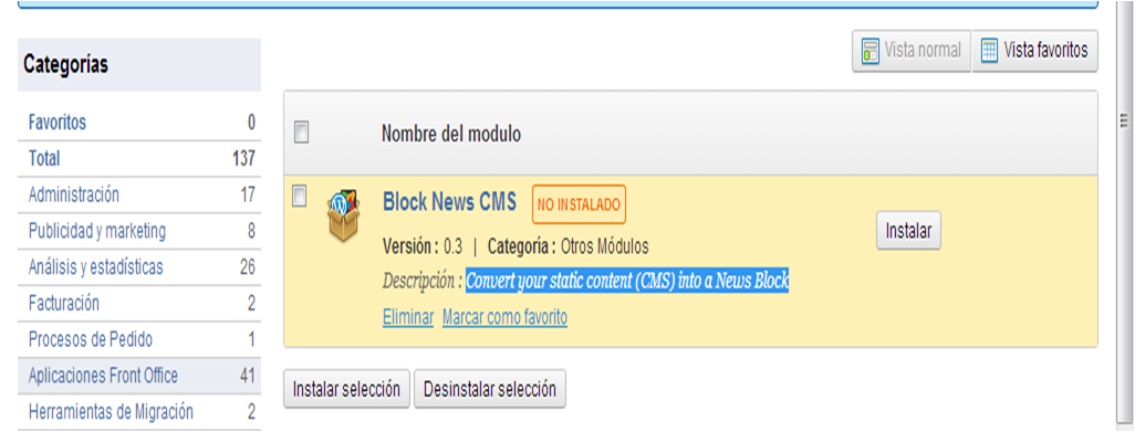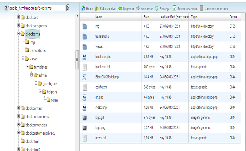 july81 Posted November 17, 2013 Author Share Posted November 17, 2013 (edited) Lo acabo de solucionar...os comento lo que he hecho por si le puede servir a alguien: (he encontrado el principio de solución aquí en el foro) 1. Me he descargado mi version de prestashop aqui: https://code.google.com/p/prestashop/downloads/list 2. He extraido la carpeta blockcms. 3. He ido al phpmyadmin a Modules->blockcms. 4. Ahi tenía las carpetas que se me habían "sobreescrito" con el nuevo modulo que había instalado. Sé cuales han sido porque la fecha de modificacion había cambiado. 5. Esos archivos modificados (blckcms.php, blockcms.tpl, config.xml, logo.gif) los he machacado con los nuevos de la carpeta extraida del punto 2. Esto lo he hecho dándole a cargar (arriba del panel una carpeta amarilla con flecha verde hacia abajo) y cuando te pregunta sobreescribir le das a ok y listo. 6. Había 2 archivos adicionales propios del módulo "malo" que directamente los he eliminado (boton derecho, eliminar). Y voilá ! Solucionado !!! Edited November 17, 2013 by july81 (see edit history) Link to comment Share on other sites More sharing options...