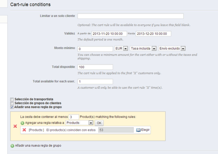 mimmbodas Posted November 20, 2013 Share Posted November 20, 2013 Hola! Tengo una tienda online www.mimmbodas.com que vende invitaciones de boda y papeleria personalizada y utilizo la version 1.5.4.1 de prestashop. Estoy intentando crear un cupón que se pueda utilizar cuando el cliente tenga 3 o mas productos distintos en su carrito, independientemente de las cantidades de cada uno. Lo que me pasa es que al añadir una nueva regla de grupo me pide la cantidad de productos y no el numero de productos distintos en la cesta. Me gustaría que los clientes que comprasen invitaciones + minutas + meseros (independientemente de la cantidad de cada producto) pudiesen utilizar un cupón de descuento de 10%. Alguien sabe como puedo configurar? Muchas gracias, Link to comment Share on other sites More sharing options...