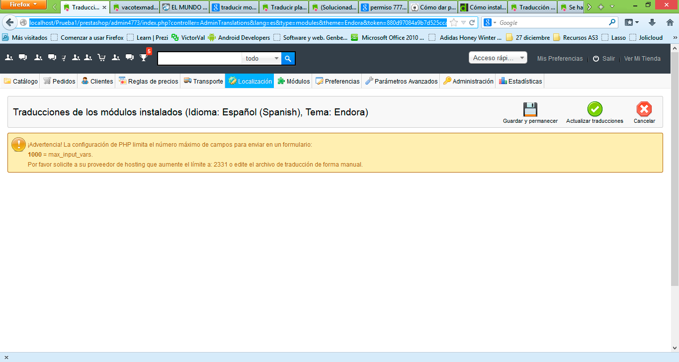 cartuyas Posted November 21, 2013 Share Posted November 21, 2013 Good afternoon, I am new to this and it is an emerging problem that I'm unable to solve.Also I did not answer from the forum template. I have searched google and no solution has helped me. I am using Xampp and my Prestashop version is 1.5.5.0; My Web Server Version: Apache/2.4.4 (Win32) PHP/5.4.19 OpenSSL/0.9.8y I need to translate to Spanish some titles of the modules installed in my template Endora themeforest. ( screenshot2 attached ) and when I try to do (Location -> Translate messages -> Translations installed modules -> Template Endora -> Spanish Flag) shows me a warning message: ( screenshot1 attached ) . So I modified the php.ini: ( screenshot3 attached ) By modifying the php.ini let me modify the frontend but I jump the same error when I select 'Translations of the installed modules.' In turn, when I change the frontend, I seek the literal translation of the title of the module if not translated properly, and does not appear. Attached files both within Prestashop translations as translations files within the template (Endora) if miss any.( screenshot4 attached ) Have also created a new php.ini file with max_input_vars value = 5000, and has not worked. Thank you very much in advance, I hope you help me to solve my problem. Regards Link to comment Share on other sites More sharing options...