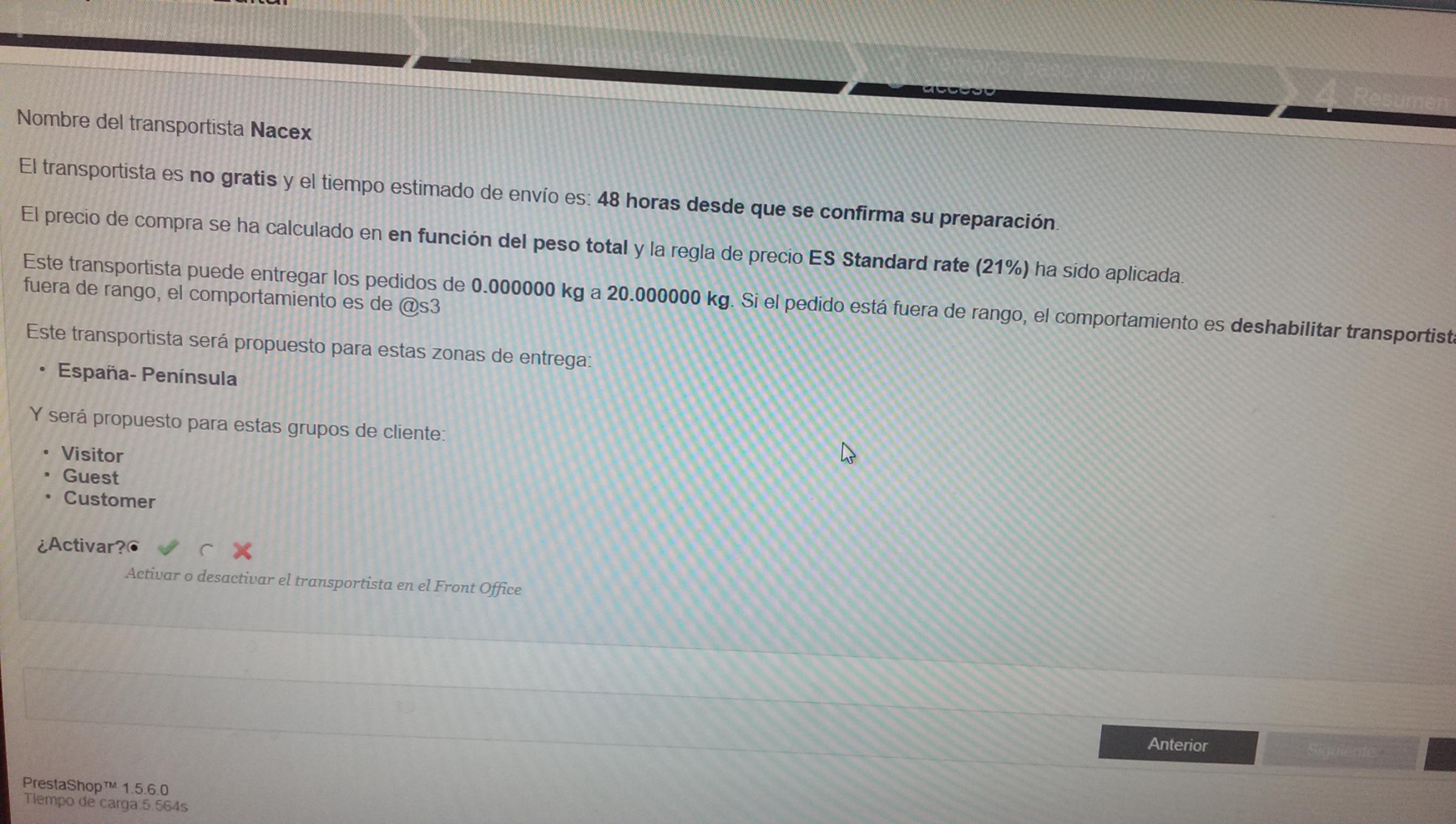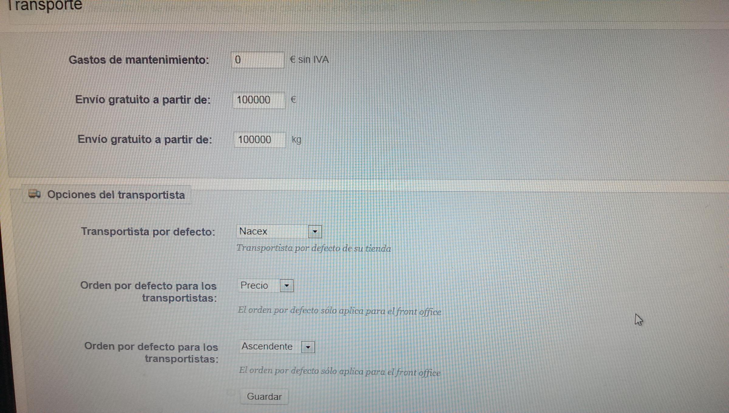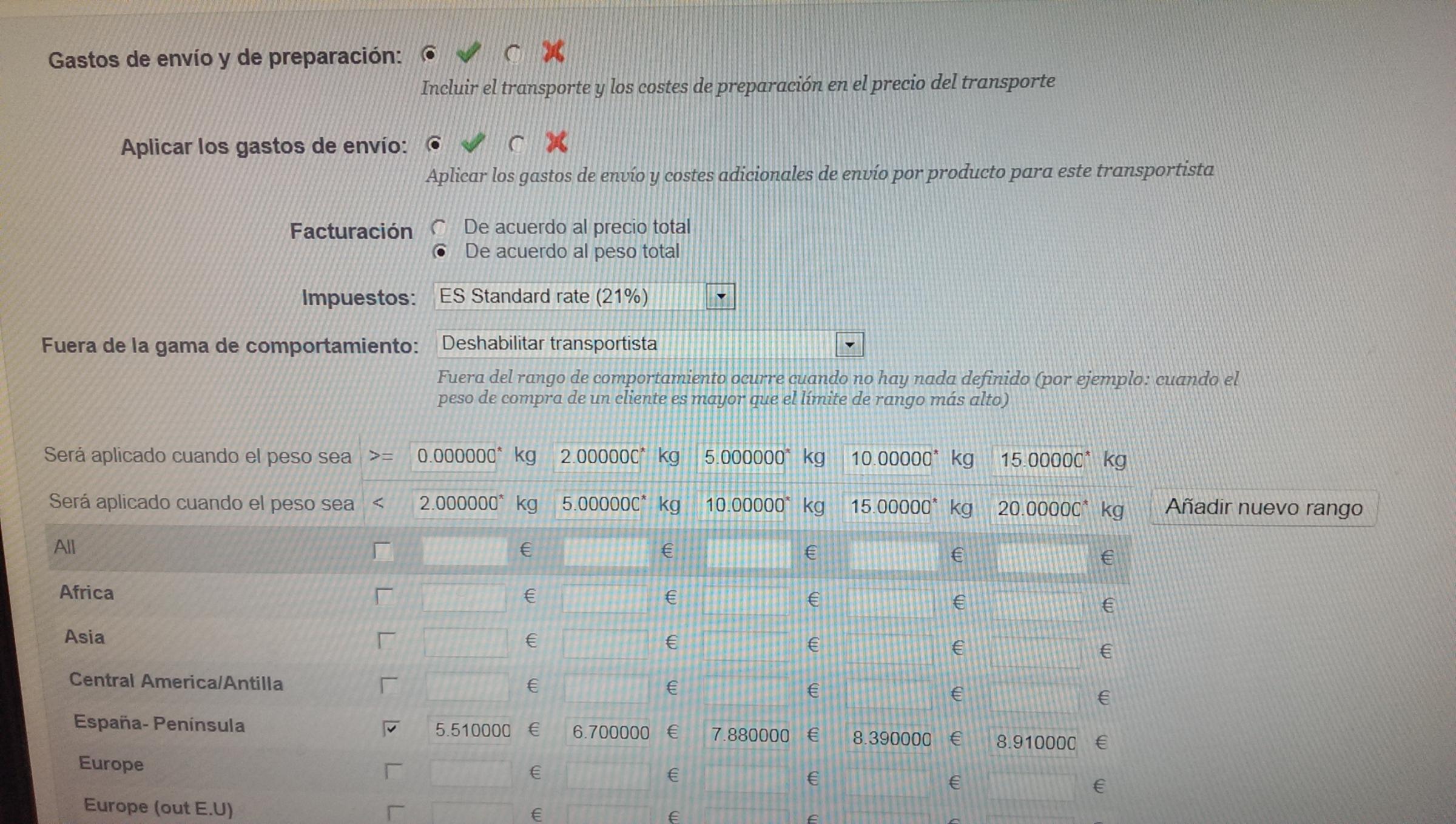 manolito69 Posted November 22, 2013 Share Posted November 22, 2013 vamos a ver, os cuento: en transporte/mantenimiento tengo la primera foto con su configuración, pasado un tiempo el transportista por defecto que aparece se quita y se pone sólo el mejor precio. Luego en transportistas tengo la segunda foto, en la que se puede ver que está desastivado el tranporte gratuito de nacex. Luego en la tercera foto tengo configurado los tramos de peso y precio. En la cuarta foto otra configuración. La otra foto es un resumen de la configuración. La última foto es la ficha del producto donde aparece su peso. ¿qué hago mal? Link to comment Share on other sites More sharing options...