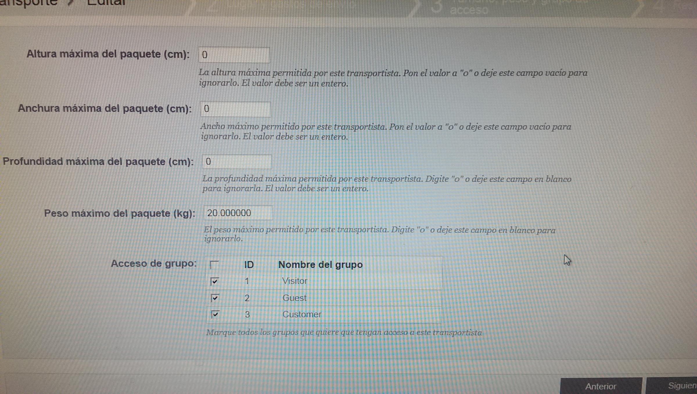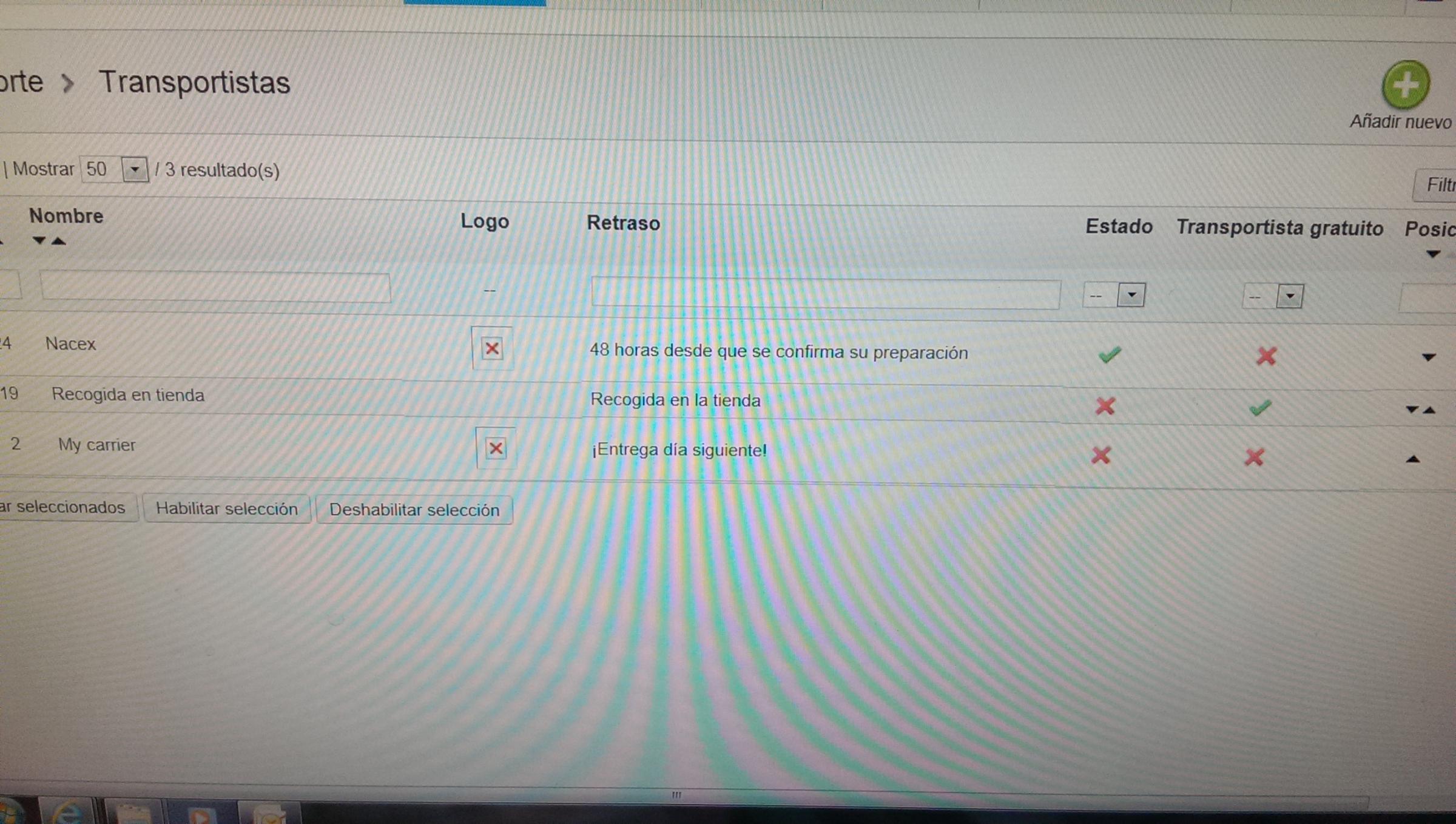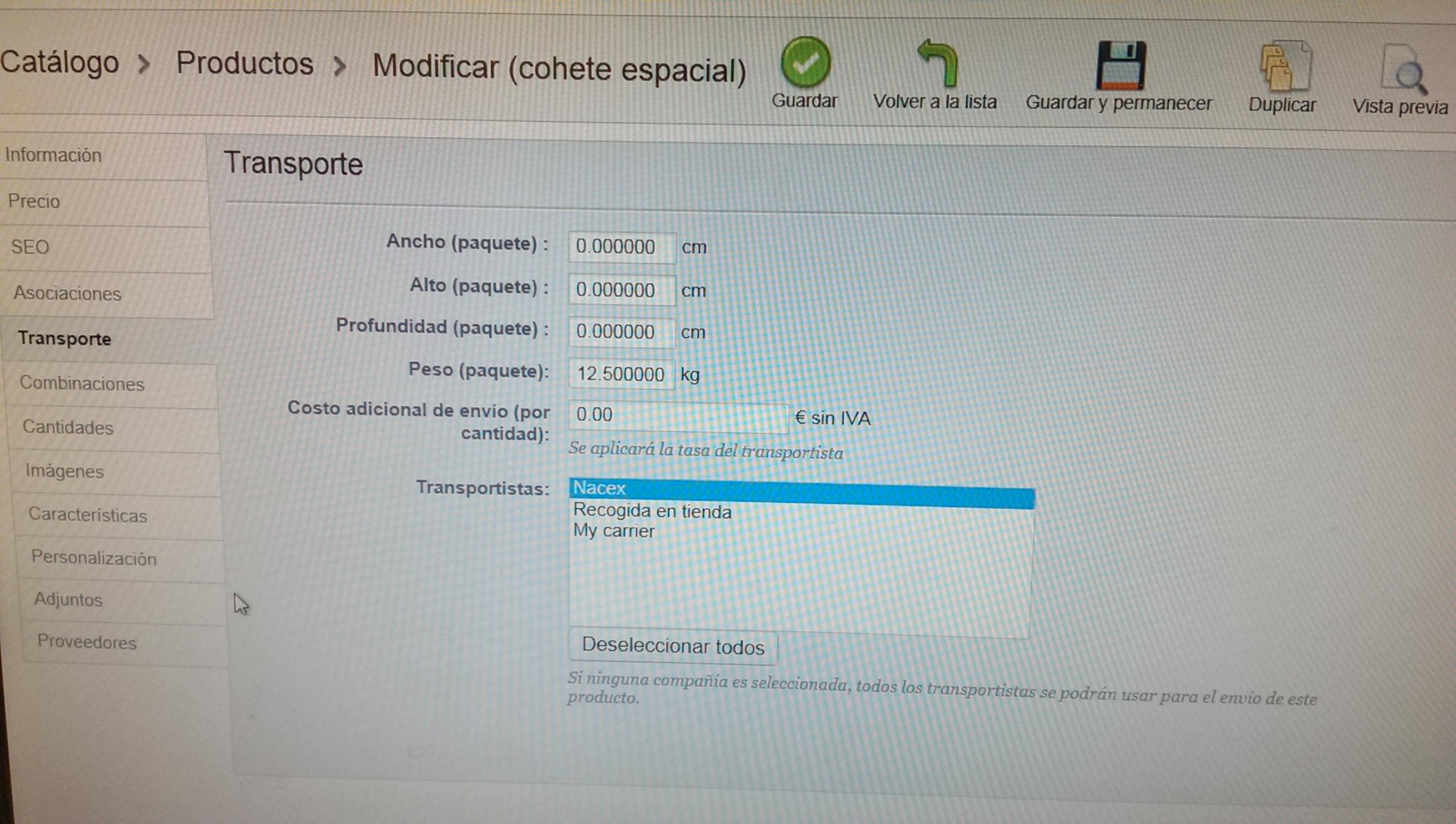 manolito69 Posted November 22, 2013 Share Posted November 22, 2013 vamos a ver, os cuento: en transporte/mantenimiento tengo la primera foto con su configuración, pasado un tiempo el transportista por defecto que aparece se quita y se pone sólo el mejor precio. Luego en transportistas tengo la segunda foto, en la que se puede ver que está desastivado el tranporte gratuito de nacex. Luego en la tercera foto tengo configurado los tramos de peso y precio. En la cuarta foto otra configuración. La otra foto es un resumen de la configuración. La última foto es la ficha del producto donde aparece su peso. ¿qué hago mal? Link to comment Share on other sites More sharing options...