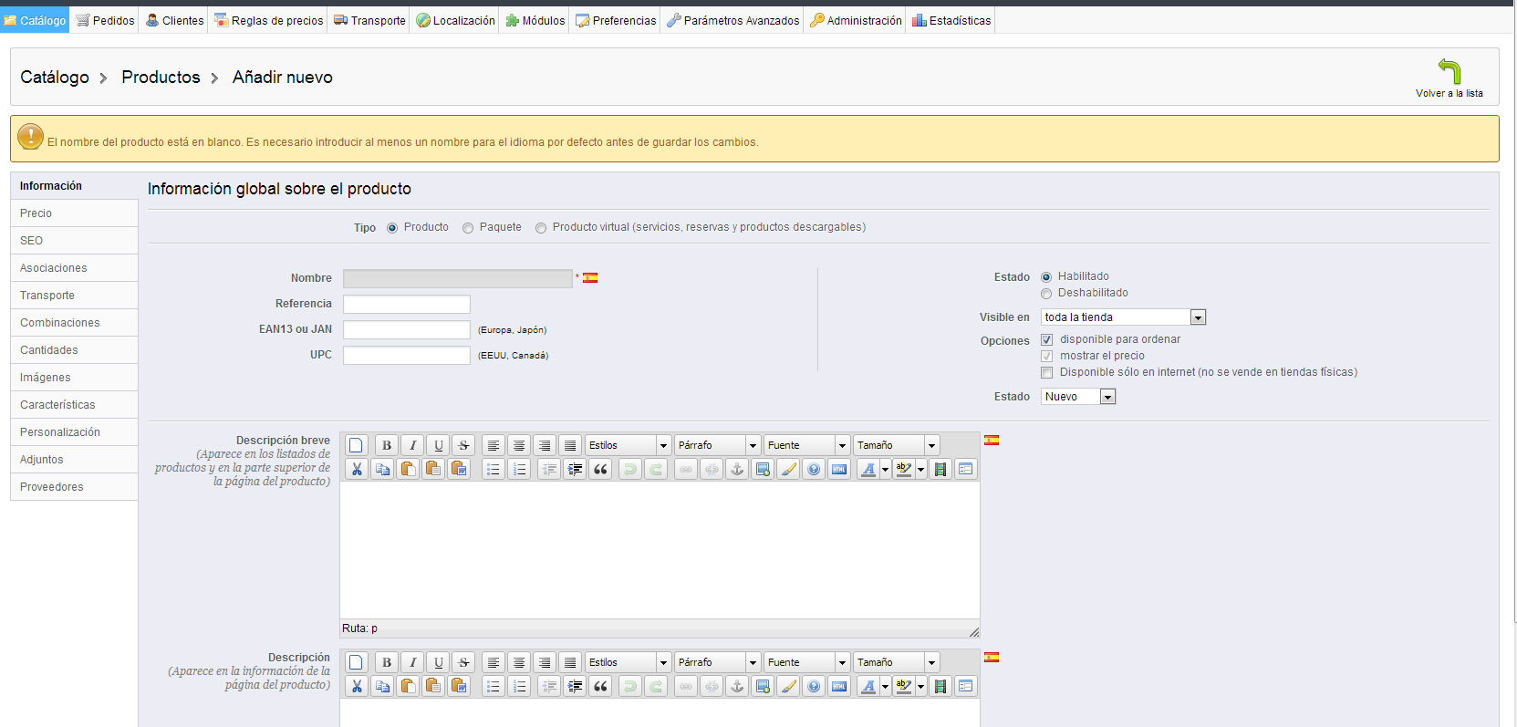 lbp Posted November 22, 2013 Share Posted November 22, 2013 (edited) Después de poner y quitar productos de la tienda de pruebas que estoy montando, borre todos los productos de mi tienda y ahora quería empezar a crear nuevos productos y no me deja pasar del primer paso. La casilla de "Nombre" aparece como sombreada y no me deja escribir el nombre del producto y sale el mensaje diciendo "El nombre del producto está en blanco. Es necesario introducir al menos un nombre para el idioma por defecto antes de guardar los cambios" y ni me deja guardar, ni seguir ni nada, solo salir de la pantalla y volver a entrar, pero nada. Adjunto captura de pantalla para ver si alguien me puede hacer ver la luz.... Saludos Edited November 23, 2013 by lbp (see edit history) Link to comment Share on other sites More sharing options...