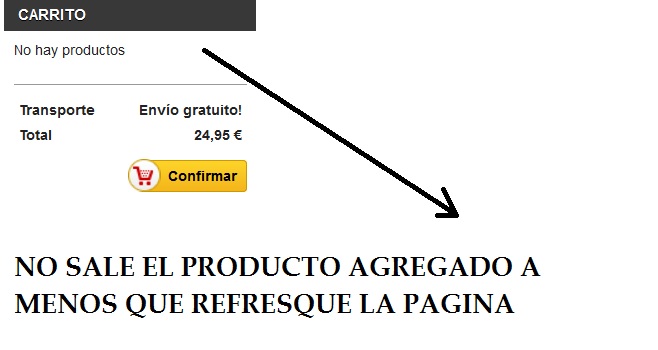 azahara Posted November 23, 2013 Share Posted November 23, 2013 Tengo el carro en el lado derecho como modulo, pero cuando se añade un producto no aparece el producto, y crea confusion, me gustaria que saliera el producto, para que salga hay que refrescar la pagina y asi reconozca el nombre del producto. Version 1.5.6 Link to comment Share on other sites More sharing options...