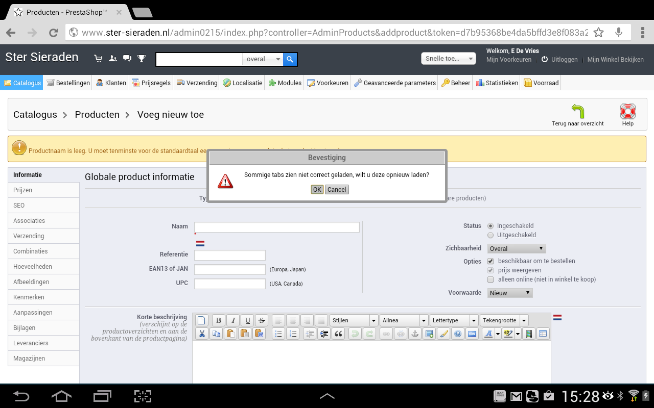 Ster Posted November 25, 2013 Author Share Posted November 25, 2013 Excuses voor de incomplete post. Hierbij een aanvulling en ik hoop dat iemand mij verder kan helpen. - De template is Theme560 - Prestashop versie 1.5.6 - Url. ster-sieraden.nl Zie bijgevoegd screenshot voor het bericht dat ik krijg als ik een product wil toevoegen. De tabbladen die wegblijven zijn die van de categorieën. Ik kan helemaal geen producten meer toevoegen. Gisteren heb ik een compleet nieuwe installatie gedaan met de hoop dat dit het probleem zou oplossen, maar helaas. Wel is de menubalk nu weer op de juiste plaats, dus dat probleem is opgelost. Op Google gezocht maar verder geen oplossingen gevonden voor dit probleem. Kan iemand mij verder helpen. Als er meer info nodig is dan hoor ik het graag. Alvast bedankt Link to comment Share on other sites More sharing options...