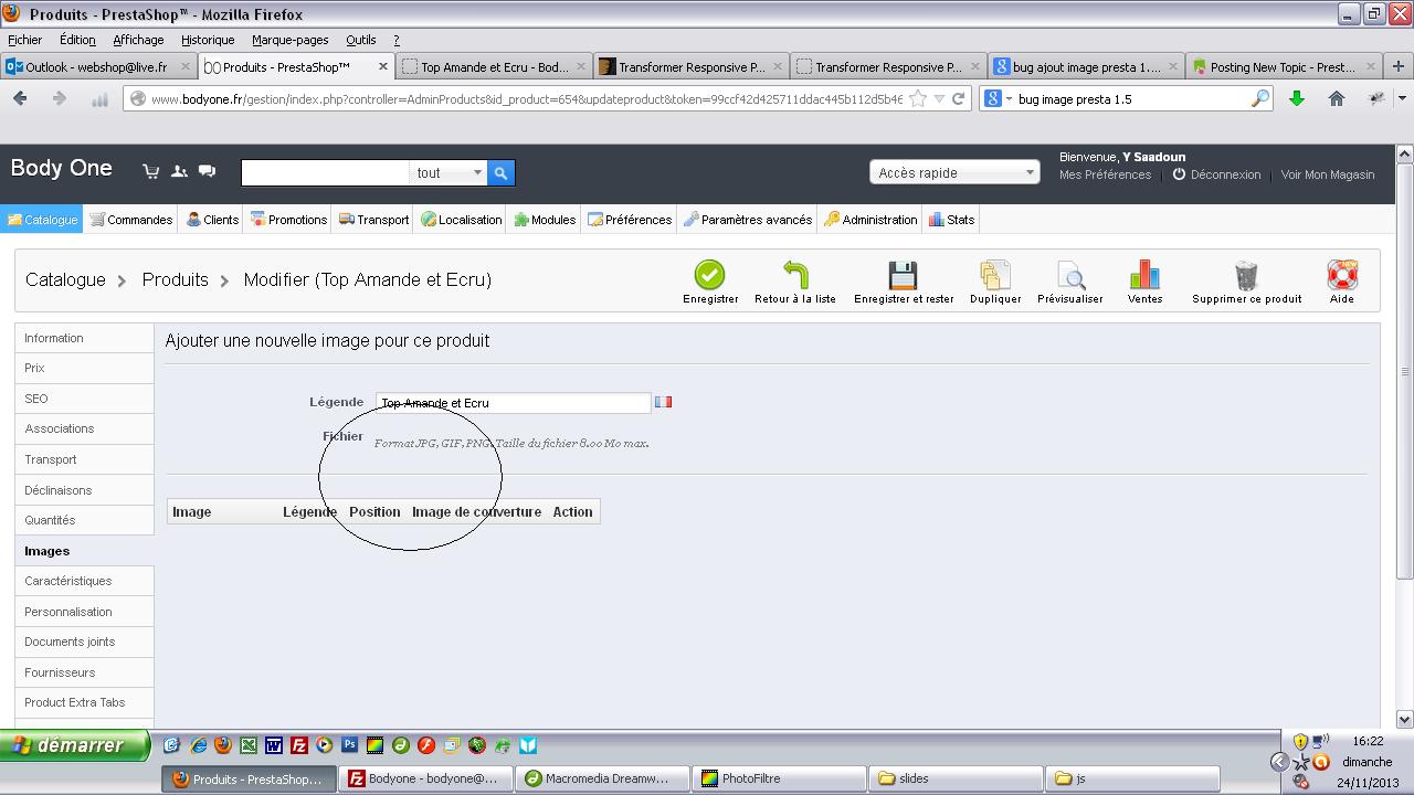 webshop Posted November 24, 2013 Share Posted November 24, 2013 Bonjour, Apres une mise a jour automatique de ma boutique en 1.5, je rencontre quelques bug dans mon BO. Sur une fiche produit: - Dans "associations", je ne vois pas mes categories (voir image) - Dans "images", Je ne vois plus mes images et impossible d'en rajouter. Merci pour votre aide précieuse Link to comment Share on other sites More sharing options...