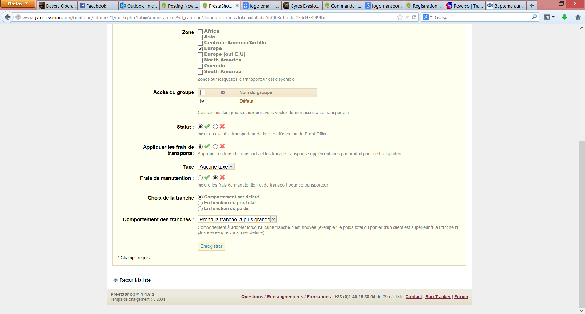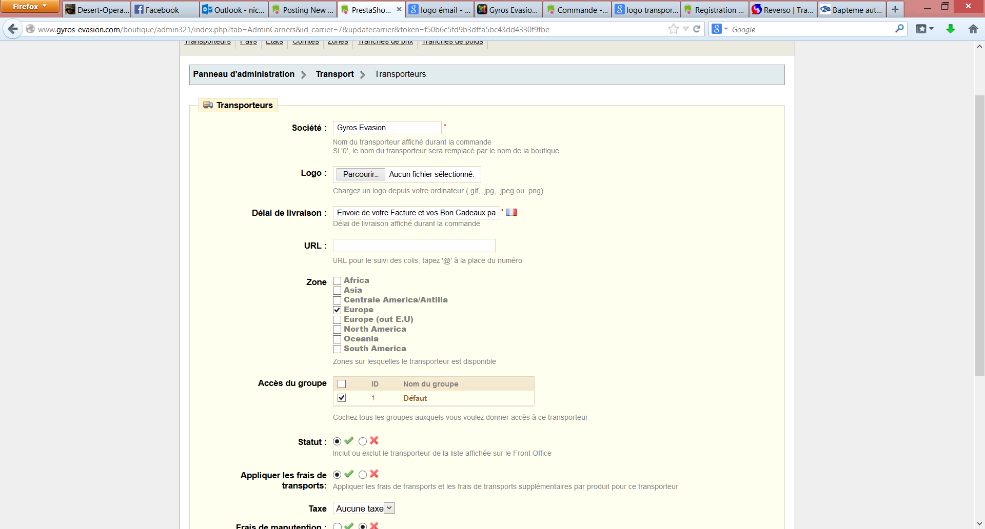 Voltigeurs26 Posted November 24, 2013 Share Posted November 24, 2013 Bonjour à tous Volia mon problème quand je mais un logo émail ou colissimo dans la rubrique transports et que je fais enregistrer il n'apparait pas quand le client effectue sa commande. Acces groupe est clicquer défaut et j'ai Prend la tranche la plus grande. Pour info je vend des baptêmes de l'air, donc le prix du transports et gratuit car j'envoie les Bon Cadeaux par émail c'est pour sa que je voudrais mettre le logo émail suivant. http://www.google.fr/imgres?sa=X&biw=1536&bih=762&tbm=isch&tbnid=6opsdI4bWRxQ-M:&imgrefurl=http://blog.andor-studio.com/tester-format-adresse-email-javascript/&docid=bQmB-6PKbR0jJM&imgurl=http://blog.andor-studio.com/wp-content/uploads/2013/02/email_logo.jpg&w=1833&h=2125&ei=6kySUvXFAq3z0gWeroHgDw&zoom=1&iact=hc&vpx=4&vpy=171&dur=847&hovh=242&hovw=208&tx=86&ty=144&page=1&tbnh=141&tbnw=120&start=0&ndsp=38&ved=1t:429,r:0,s:0,i:83 Si quelqu'un peut me dire comment on doit faire pour que le Logo apparaise, ou ce que j'ai oublier. Je vous et mis deux copie d'ecran en pièce ci jointe Merci a vous pour votre aide Link to comment Share on other sites More sharing options...