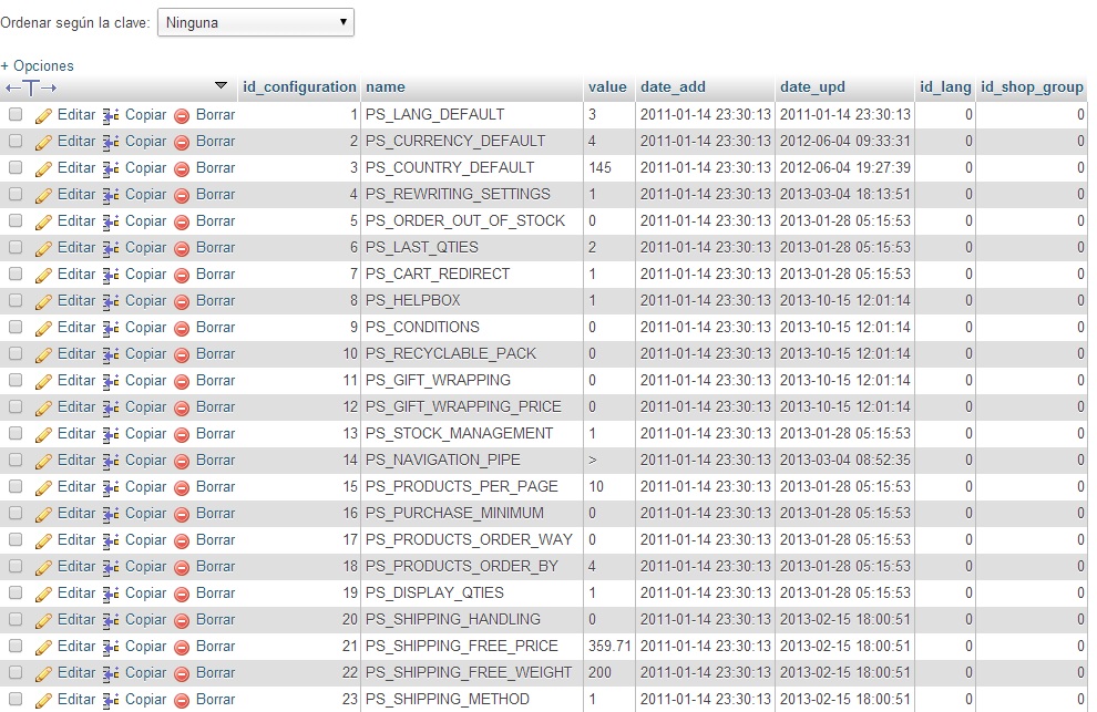 ventura Posted November 25, 2013 Share Posted November 25, 2013 Sí, al entrar a la tabla hw_configuration la columna aparece ahí. Pero su valor es 0 en todos los campos: Utilizas multi-tienda ?, si no es asi debería tener valor null , mira a ver como has configurado la columna 1 Link to comment Share on other sites More sharing options...