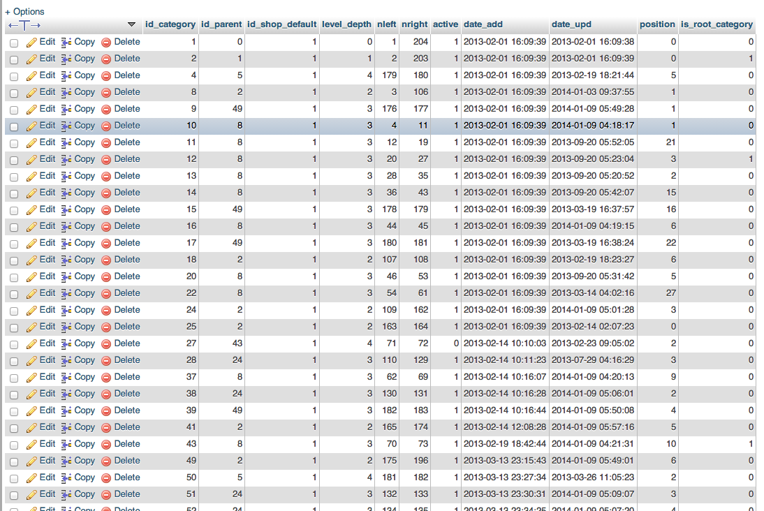 Teapot Creative Posted February 24, 2014 Share Posted February 24, 2014 (edited) Hi hello please check ps_categories table for enourmous values in nleft + nright columns, sometimes problem is related to this case (can you also paste screenshot of ps_categories table?) btw. your store is under maintenance mode. Hi " enormous values in nleft + nright columns" when you say "enormous" what do you define as to big? Nick Edited February 24, 2014 by Teapot Creative (see edit history) Link to comment Share on other sites More sharing options...