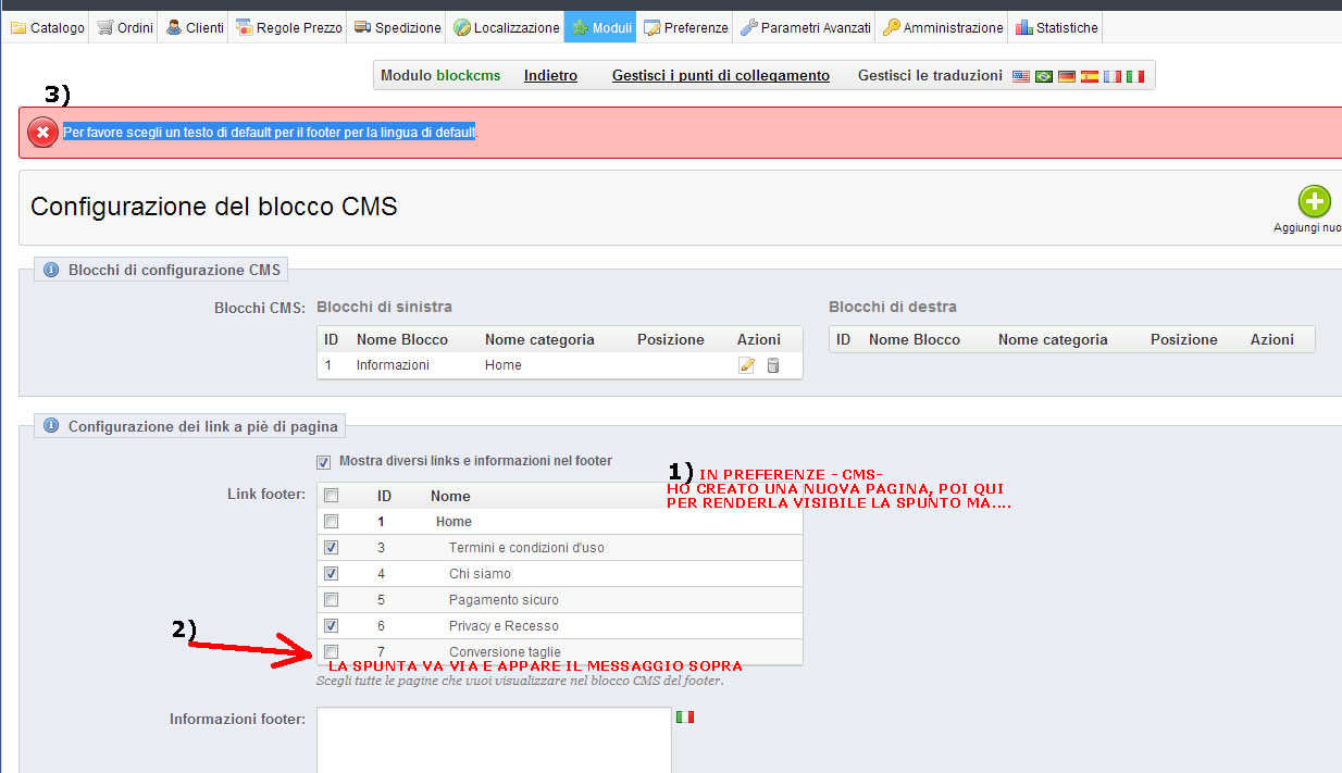 cesareaugusto Posted November 27, 2013 Author Share Posted November 27, 2013 Ciao a tutti, ho questo problema: premetto di aver cancellato dal mio tema - modules - blockcms.tpl nella stringa relativa al codice footer 3 voci in quanto ho visto che era l'unico modo per toglierle dal footer stesso (il codice tra li e li per intenderci, relativo a nota legale e altri 2). Problema: vado a creare nuova pagina in preferenze - cms poi vado in moduli - blockcms per selezionare la nuova pagina e renderla visibile nel riquadro footer, dopo aver salvato (e me lo ha fatto anche prima della cancellazione della stringa) succede che la spunta va via ed esce il messaggio di errore in alto che dice: Per favore scegli un testo di default per il footer per la lingua di default. Vi è mai successo? Come si risolve? Grazie Non è capitato mai a nessuno questo problema?? Link to comment Share on other sites More sharing options...