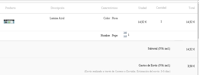 nitsuga1986 Posted November 27, 2013 Share Posted November 27, 2013 Hola, he añadido un producto personalizado a mi catalogo, es un text field que lo uso para meter un nombre. Hasta aqui funciona todo perfecto, hasta que añado el producto al carrito, cuando lo añado y me voy al carrito no se porque, pero me elimina el boton de DELETE de cada linea y me es imposible actualizar tambien la cantidad (desaparecen los botones +/-), ademas, me aparece una nueva "cantidad" para el atributo NOMBRE. ¿que puede estar pasando? Adjunto una imagen del carrito, para que veais como queda. Un saludo Muchas gracias Link to comment Share on other sites More sharing options...