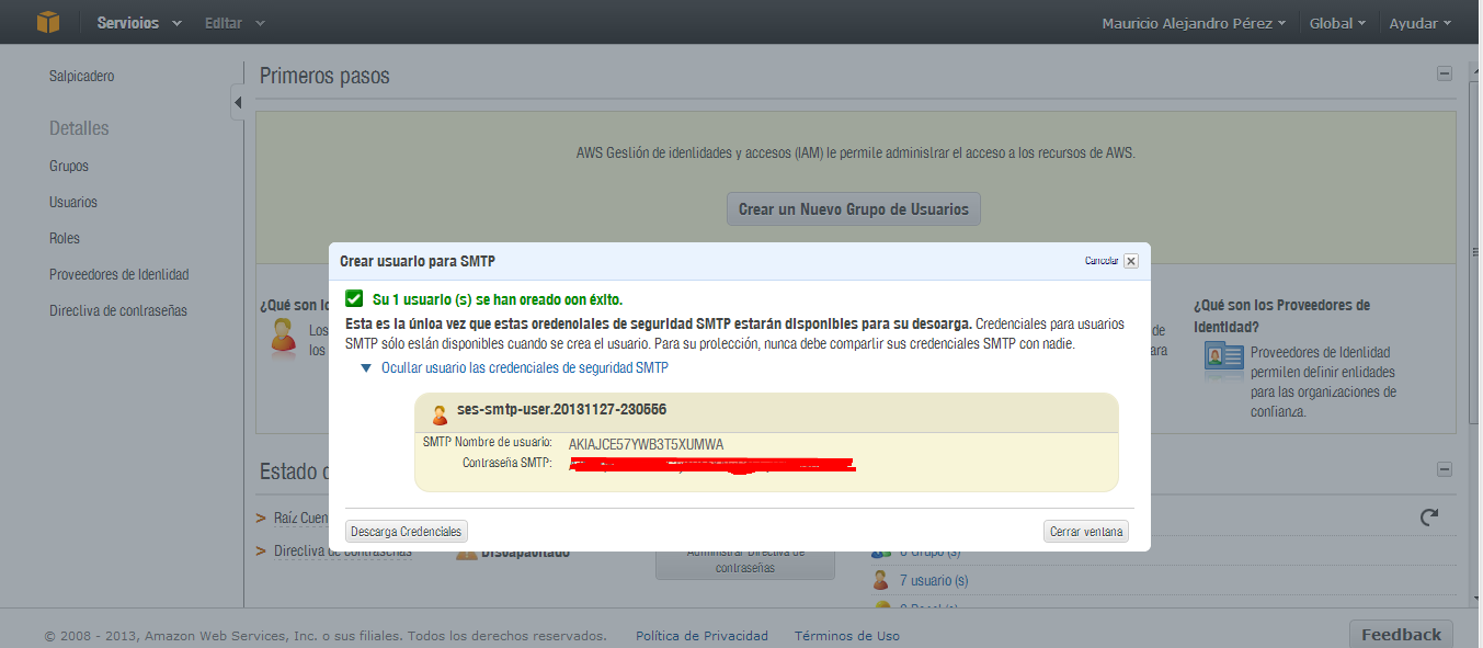 [email protected] Posted November 28, 2013 Author Share Posted November 28, 2013 En tu cuenta busca las credenciales smtp para tu cuenta, aqui un poco de ayuda: http://docs.aws.amazon.com/ses/latest/DeveloperGuide/smtp-credentials.html Saludos. Gracias por tu colaboracion, creo que realice bien el proceso en amazon, pero por si las moscas pongo las imagenes, te agradezco tu amable colaboracion. Link to comment Share on other sites More sharing options...