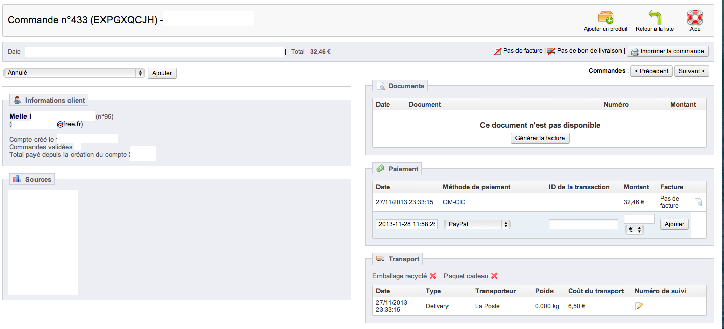 droidente Posted November 28, 2013 Share Posted November 28, 2013 (edited) Bonjour à tous, depuis hier, j'ai de gros soucis avec prestashop. En effet, quand quelqu'un passe commande sur mon site, je ne vois plus le paiement et la commande n'est plus validé. En gros, pas de facture (à moins de la générer manuellement) En plus de ça rien ne me dis que la commande est passé ou non. J'ai fais des essais et ça me le fait également quand je passe commande. Mon site www.e-garette.fr (passé en maintenance) et je suis sur la version 1.5.6.1 Je me demandes si il est possible de downgrader et retrouver un fonctionnement normal. Je vous ai mis une capture d'ecran. Dans le cas présent, on voit le paiement, on sait qu'il est passé mais il n'a pas passé la commande en validé comme il le fait habituellement... Merci à tous. Edited November 28, 2013 by droidente (see edit history) Link to comment Share on other sites More sharing options...