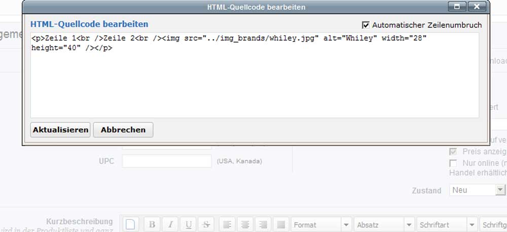 Whiley Posted December 4, 2013 Share Posted December 4, 2013 Hallo davigo Der eingebaute Editor kann wirklich auch HTML editieren, nicht nur anzeigen? klar, bei manueller Eingabe funktioniert das! Wenn du z.B. das in die Kurzbeschreibung im HTML-Editor eingibst: dann ist das das Ergebnis: Ich habe vor ein paar Wochen mal probiert das beim csv-Import hinzubekommen, bin aber gescheitert! Grüsse Whiley Link to comment Share on other sites More sharing options...