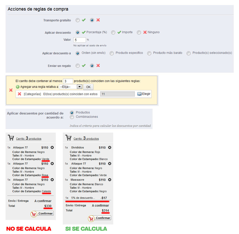 Martin-F Posted November 29, 2013 Share Posted November 29, 2013 (edited) Hola a todos, Tengo el siguiente inconveniente: Versión Prestashop: 1.5.4.1 Regla de Compra creada: Aplicar 5% de descuento cuando 3 productos pertenecientes a determinadas categorías (todas) son agregados al carrito. Defecto: Cuando agrego 3 unidades del mismo artículo, pero eligiendo diferentes combinaciones, el descuento no se calcula. Cuando agrego 3 unidades de productos diferentes (sin importar lo que haga con las combinaciones), el descuento si se calcula. (Adjunto imagen descriptiva) La única forma que encontré de que funcione fue modificando la condición: En lugar de utilizar Categorías, utilicé Productos (incluyendo todos). Hacerlo de esta manera me obliga a estar pendiente de la Condición cada vez que agrego un producto, lo cual es bastante incómodo. He encontrado casos similares en los foros en español, inglés, y hasta en francés, pero las soluciones propuestas no me han servido. Gracias de antemano, Edited November 30, 2013 by martinf (see edit history) Link to comment Share on other sites More sharing options...