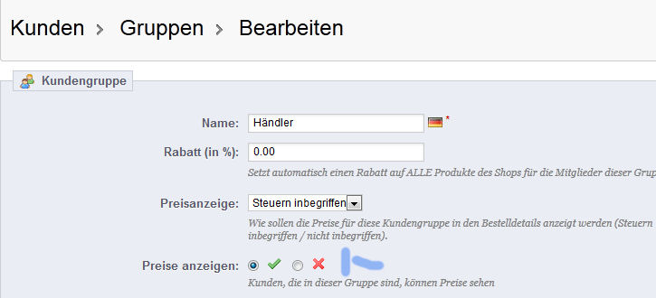 Kunden separator_breadcrumb.png Gruppen > Bearbeiten, Preise ausschalten (s. Bild)