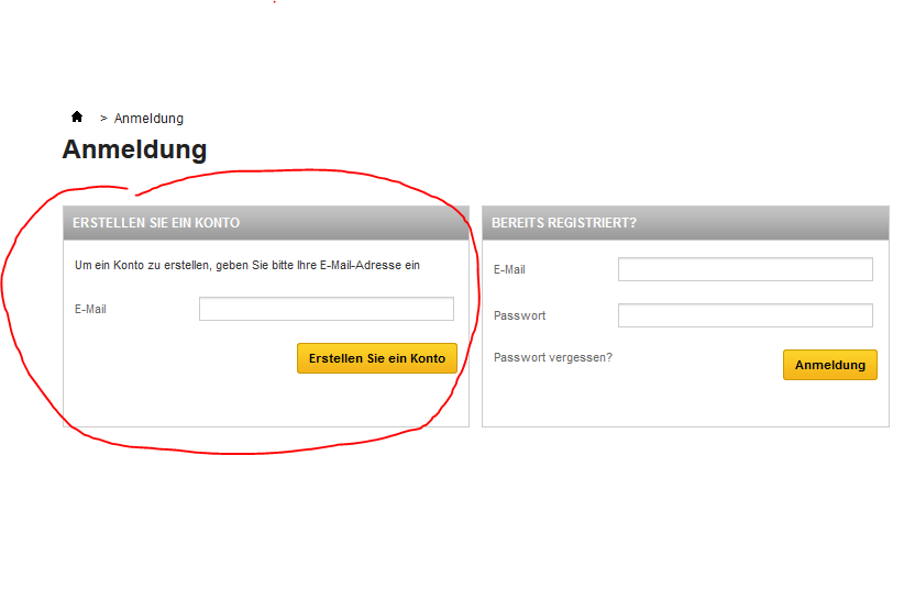 El Patron Posted November 29, 2013 Share Posted November 29, 2013 find this file themes/yourtheme/authentication.tpl save to a back up file from a native default theme, find this form <form action="{$link->getPageLink('authentication', true)|escape:'html'}" method="post" id="create-account_form" class="std"> <fieldset> <h3>{l s='Create an account'}</h3> <div class="form_content clearfix"> <p class="title_block">{l s='Please enter your email address to create an account.'}</p> <div class="error" id="create_account_error" style="display:none"></div> <p class="text"> <label for="email_create">{l s='Email address'}</label> <span><input type="text" id="email_create" name="email_create" value="{if isset($smarty.post.email_create)}{$smarty.post.email_create|stripslashes}{/if}" class="account_input" /></span> </p> <p class="submit"> {if isset($back)}<input type="hidden" class="hidden" name="back" value="{$back|escape:'htmlall':'UTF-8'}" />{/if} <input type="submit" id="SubmitCreate" name="SubmitCreate" class="button_large" value="{l s='Create an account'}" /> <input type="hidden" class="hidden" name="SubmitCreate" value="{l s='Create an account'}" /> </p> </div> </fieldset> </form> and either delete it or comment out with html comment sytel, <!-- .... --> like this: <!-- <form action="{$link->getPageLink('authentication', true)|escape:'html'}" method="post" id="create-account_form" class="std"> <fieldset> <h3>{l s='Create an account'}</h3> <div class="form_content clearfix"> <p class="title_block">{l s='Please enter your email address to create an account.'}</p> <div class="error" id="create_account_error" style="display:none"></div> <p class="text"> <label for="email_create">{l s='Email address'}</label> <span><input type="text" id="email_create" name="email_create" value="{if isset($smarty.post.email_create)}{$smarty.post.email_create|stripslashes}{/if}" class="account_input" /></span> </p> <p class="submit"> {if isset($back)}<input type="hidden" class="hidden" name="back" value="{$back|escape:'htmlall':'UTF-8'}" />{/if} <input type="submit" id="SubmitCreate" name="SubmitCreate" class="button_large" value="{l s='Create an account'}" /> <input type="hidden" class="hidden" name="SubmitCreate" value="{l s='Create an account'}" /> </p> </div> </fieldset> </form> --> This on a native 1.5.6.1 with default theme results in: http://screencast.com/t/HeI5ZGwmbz Link to comment Share on other sites More sharing options...
