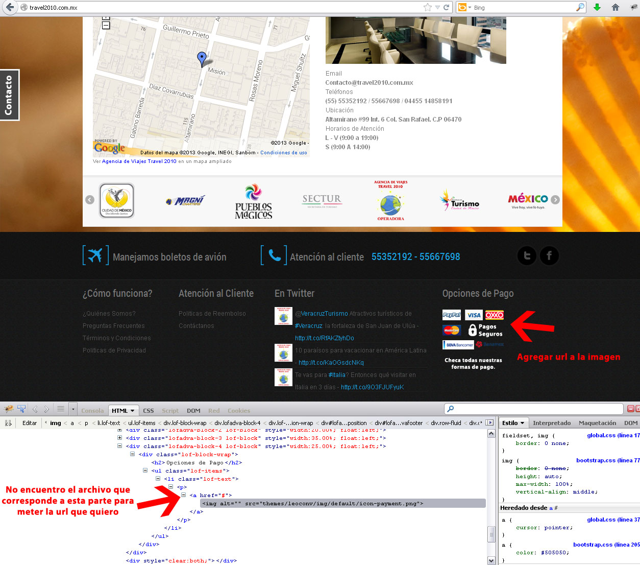 nathan316 Posted November 29, 2013 Share Posted November 29, 2013 (edited) Hola amigos buenas tardes, no soy un profesional en esto de los codigos (html, css, etc) pero me las estoy arreglando para hacer mi pagina de comercio electronico, utilizo el firebug para ir checando en que parte de los archivos se encuentra tal cosa para modificarla. Quiero meterle una URL a la imagen de opciones de pago para ver las diferentes opciones de pago, pero no encuentro el archivo en donde se deberia de colocar, se que debo quitar el simbolo de # y justo ahi colocar la url que deseo, pero por mas que busco no encuentro solucion. Adjunto una imagen. Les Agradezco su ayuda y su tiempo por leer mi post. Edited December 3, 2013 by nathan316 (see edit history) Link to comment Share on other sites More sharing options...
