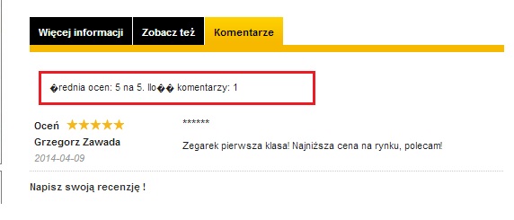 tyszek Posted December 16, 2013 Share Posted December 16, 2013 Ja obrazek widziałem tylko gdy trafiłem na wyszukiwanie gdzie był Amazon. Żadnego innego nie widziałem więc wątpię że się pojawi niestety.U mnie powinno pokazywać gwiazdki i cenę ale G mnie nie lubi i nie pokazuje;/ Dlaczego to nie mam pojęcia. Próbowałem to rozgryźć ale z marnym rezultatem Kod wstawiłem i wygląda tak: <script type="text/javascript"> var productcomments_controller_url = '{$productcomments_controller_url}'; var confirm_report_message = "{l s='Are you sure you want report this comment?' mod='productcomments'}"; var secure_key = "{$secure_key}"; var productcomments_url_rewrite = '{$productcomments_url_rewriting_activated}'; </script> <div id="idTab5"> <div id="product_comments_block_tab"> {if $comments} <span class="hreview-aggregate"> <span class="rating"> <span>Średnia ocen: </span> <span class="average">{$averageTotal}</span> na <span class="best">5</span>. Ilość komentarzy: <span class="votes">{$nbComments}</span> <span class="summary"></span> </span> </span> Jest to sam początek pliku productcomments.tplSprawdź czy w dobrym pliku wklejasz. Być może masz taki plik w katalogu themes\nazwa-themes\modules\productcomments\. Jeśli masz taki katalog a w nim wspomniany plik to musisz do niego wkleić w nie do tego z katalogu głównego modułów. Link to comment Share on other sites More sharing options...