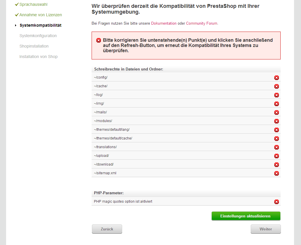 Lockesoft Posted December 6, 2013 Share Posted December 6, 2013 Sowas dürfte eigentlich nicht passieren. Egal ob Du im Browser das Fenster noch offen hast oder Installation später neu startest. Die Berechtigungen änderst Du entweder mit FTP, oder beim passenden Hosting (Server mit Rootzugriff) über SSH auch Shell genannt. Letzteres geht meist schneller. FTP meldet meist für jedes Ding einzeln den Erfolg zurück, was viel Kommunikation zwischen Server und Deinem PC bedeutet. :-) Manche Hoster bieten dafür auch sogenantes Web-FTP an, das wird dann irgendwo in den einstellungen des Kundenzugangs beim Hoster benutzt. All Inkl. ist so ein Fall HostEurope glaube ich auch. Magic Quotes wird normalerweise in der php.ini des Servers eingestellt. Das bedeutet auch wieder Root-Zugriff. Also ist das meist ein Fall für den Hoster selber das zu ändern. Andere Hoster erlauben auch eine eigene php.ini im Basisverzeichnis des Hostings. Manche Hoster erlauben allerdings auch die für PrestaShop benötigten Parameter über eine Datei .htaccess einzustellen. Diese Datei muss im Basisverzeichnis der Applikation liegen, also im Shopverzeichnis und ist normalerweise versteckt (das sagt der Punkt vor dem Dateinamen aus). In die Datei kommen dann Zeilen im Sinne von: php_value magic_quotes 0 php_flag magic_quotes off php_value magic_quotes_gpc 0 php_flag magic_quotes_gpc off php_value memory limit 256m Bei magic_quotes scheint es mehrere Möglichkeiten zu geben. Müsstest Du ausprobieren... Und was ich in jedem Fall mal ausprobieren würde ist im Abschnitt "Generelle Fragen" dieses Forums den Post "Forumsreglen" einmal zu lesen, damit du beim nächsten Posting bessere oder genauere Antworten bekommen kannst, weil du denen, die dir antworten sollen jetzt zu Deiner Frage auch die nötigen Hintergrundinformationen mitgegeben hast. :-) LG Klaus / Lockesoft Link to comment Share on other sites More sharing options...
