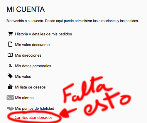 cargobra Posted December 10, 2013 Share Posted December 10, 2013 Hola buenos días. Tengo un problema. He instalado el modulo "retome contacto con sus clientes" que lo que hace es mandarle un mail a los clientes diciendole que se dejo un carrito abandonado y lo puede retomar entrando en su cuenta de cliente. Luego se le puede obsequiar con un % de descuento. El tema es que el mail llega y sale el enlace a la web diciendo que entre en su cuenta y visite sus carritos abandonados. Pero no aparece ninguna pestaña con los carritos abandonados. Salen los datos personales, los vales de descuento, las direcciones... pero los carritos abandonados, no. ¿Alguien sabe como hacer para que se vean los carritos abandonados en tu cuenta de cliente? Gracias. Link to comment Share on other sites More sharing options...