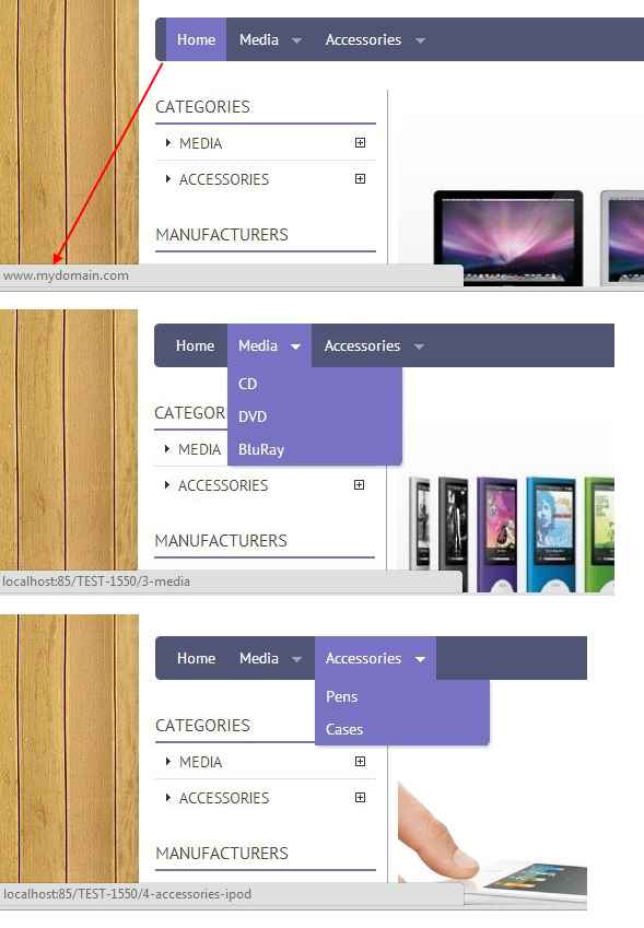 Tyian Posted December 11, 2013 Author Share Posted December 11, 2013 (edited) Tyian, are you OK with setting up the category structure? You can set up a new product category called e.g. Media whose parent is the Home category. Then you can amend the existing categories CD, DVD & Bluray so that their parent category is Media. Then add new categories Pens and Cases whose parent category is Accessories. You can then configure the Top horizontal menu module. I see that you already have the link to the home page as your first entry in the menu. Remove the others, then from the list on the left, select and add the categories Media then Accessories. Obviously you will need to translate these terms as required. Boa tarde! Dave Boa tarde! Yes, I think my category structure is ok. The problem is that the sub menu option get mess up and I dont know why. EX: My structure: The Top horizontal module: The final result: What Im going wrong? What is the problem? Why the sub menu get all mess up? Thank you És Português? Edited December 17, 2013 by Tyian (see edit history) Link to comment Share on other sites More sharing options...