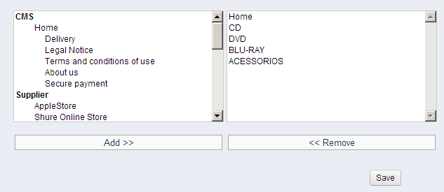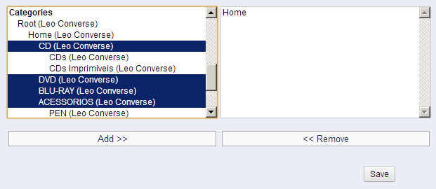 stottycabanas Posted December 11, 2013 Share Posted December 11, 2013 Tyian, are you OK with setting up the category structure? You can set up a new product category called e.g. Media whose parent is the Home category. Then you can amend the existing categories CD, DVD & Bluray so that their parent category is Media. Then add new categories Pens and Cases whose parent category is Accessories. You can then configure the Top horizontal menu module. I see that you already have the link to the home page as your first entry in the menu. Remove the others, then from the list on the left, select and add the categories Media then Accessories. Obviously you will need to translate these terms as required. Boa tarde! Dave Link to comment Share on other sites More sharing options...