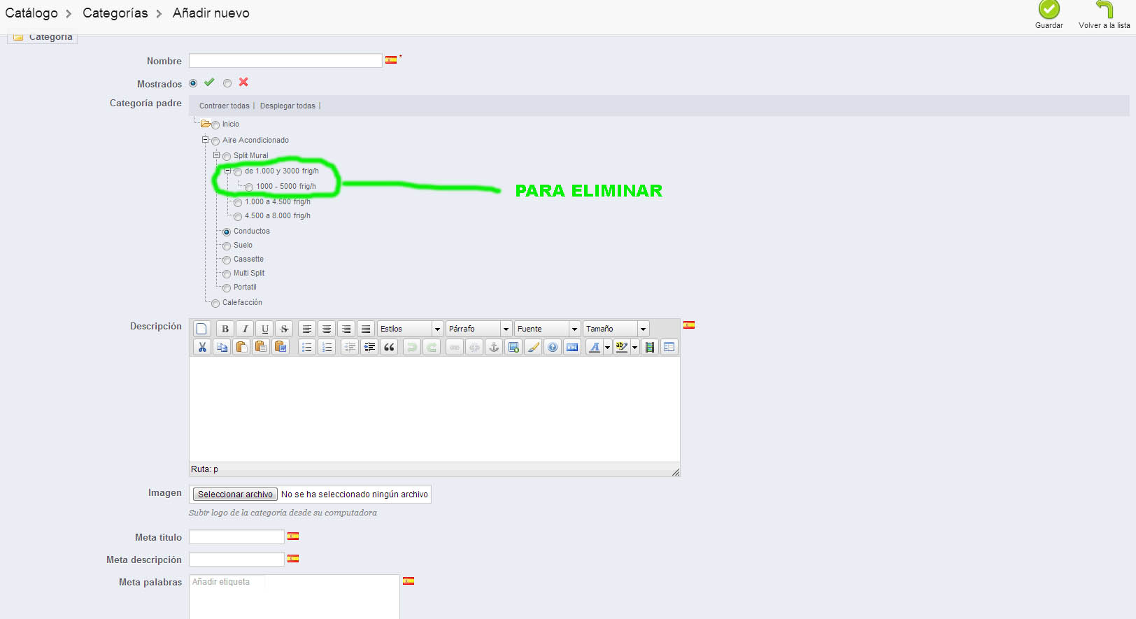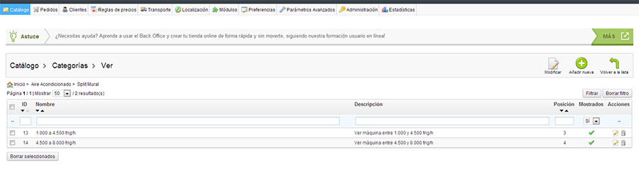 lbp Posted December 11, 2013 Author Share Posted December 11, 2013 (edited) hola soy luisa, a ver si puedo echarte una manita. Vete a tu panel de administración y selecciona catalogo, dentro de este categorias ,selecciona la categoria padre donde cuelga esa subcategoria que quieres eliminar y hay te mostrará las subcategorias de esa categoria padre.Bueno pues en la parte derecha tienes una el dibujo de un contenedor, el cual elimina la subcategoria. Si tienes alguna duda mas, ya sabes Hola Luisa, muchas gracias por la respuesta pero no. ESE precisamente es el problema. Yo desde el Back Office si entro en Catalogo - Categorías y de ahí a la subcategoria que quiero llegar, veo lo que tengo en la imagen que adjunto ahora y efectivamente, puedo editarlo o eliminarlo. Pero cuando creo un producto y lo quiero asociar a su categoría, veo otro sub-nivel mas del que puedo ver en esta pantalla de categorías que es el adjunto que mande primero y que qui no veo........ Luis Edited December 11, 2013 by lbp (see edit history) Link to comment Share on other sites More sharing options...