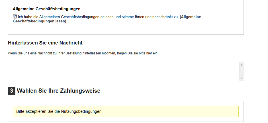 Es erscheint unter "Wählen Sie Ihre Zahlungsweise" der Satz: "Bitte akzeptieren Sie die Nutzungsbedingungen." (siehe Screenshot) Wenn man die Nutzungsbedingungen akzeptiert, passiert nichts. Es werden keine Zahlungsweisen angezeigt. Es ist keine Bestellung möglich.