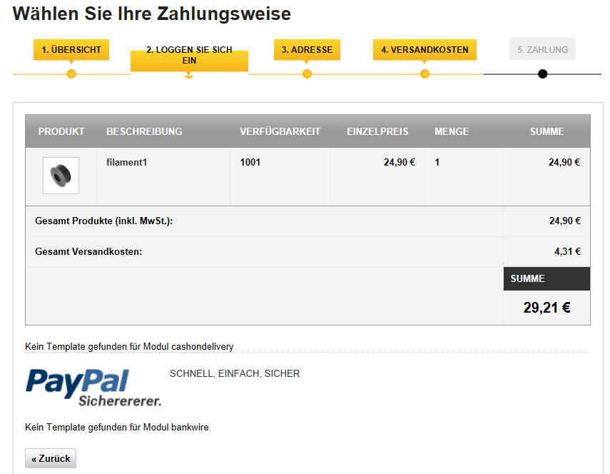 Es erscheint nur Paypal als Zahlungsmöglichkeit. Paypal funktioniert hier, im Gegensatz zum One-Page-Checkout. Für die anderen Module steht: