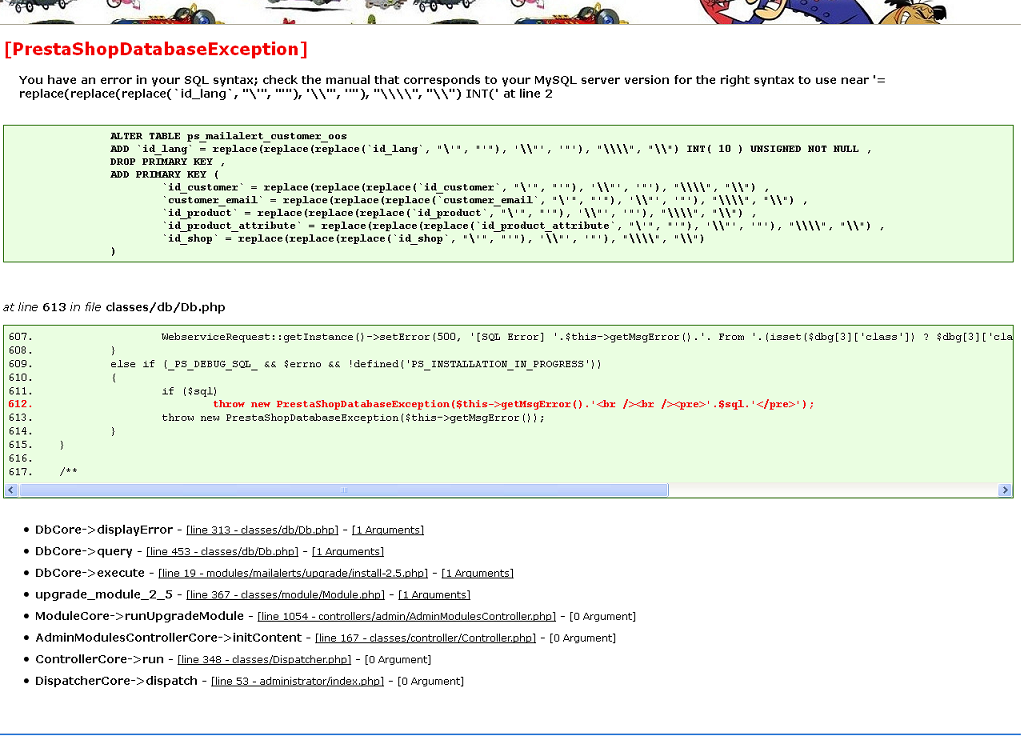 Paula Martinez Posted December 11, 2013 Share Posted December 11, 2013 Hola a todos, Hoy he subido mi web y tras resolver varios problemas gracias a la busqueda de los mismos en este y otros foros he ido pudiendo ir hacia adelante, pero cuando creo que lo tengo todo listo, me sale un error que no soy capaz de solucionar. Cuando en mi back pulso sobre la opcion "Modulos" del desplegable de la pestaña "Modulos" (V1.5.6) me salta el siguente error de la imagen adjunta (tengo habilitado la muestra de errores). Por supuesto, en el resto de pestañas de los modulos, no hay errores. solo este y en esta pestaña concreta. errorsql.PNG lo mio no es el SQL la verdad Me podeis decir por que me salta?. Como puedo corregirlo ? Muchas gracias Hola, Me llamo Raul Martinez, Por lo que se ve en la imagen, parece que te esta dando problemas la tabla: ps_mailalert_customer_oos el campo id_lang de la tabla, parece como si no lo tuvieras, prueba ejecutar esto: ALTER TABLE `ps_mailalert_customer_oos` ADD `id_lang` INT( 10 ) UNSIGNED NOT NULL , DROP PRIMARY KEY , ADD PRIMARY KEY ( `id_customer` , `customer_email` , `id_product` , `id_product_attribute` , `id_shop` ) ; desde phpmyadmin, a ver si funciona. Link to comment Share on other sites More sharing options...