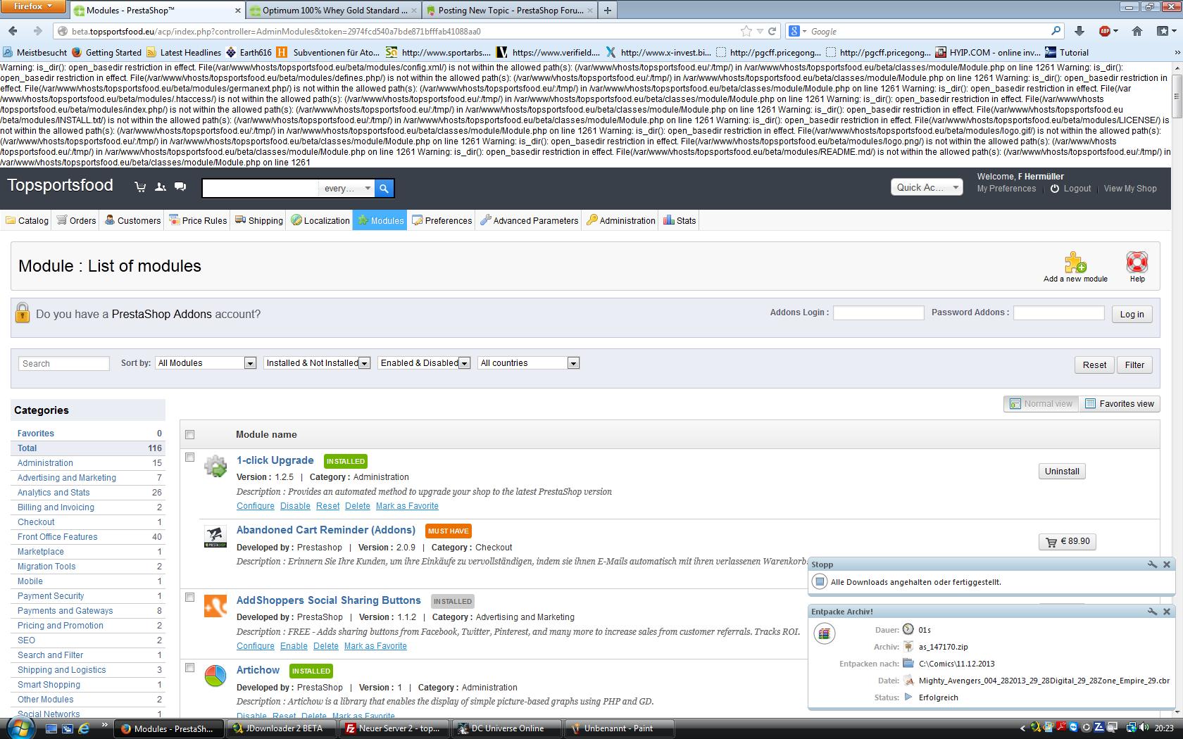 Fabsh Posted December 12, 2013 Share Posted December 12, 2013 Hello, if upgrade my prestashop version from 1.5.3.1 to the newest. If turned the debug mode on and now im getting the following error code Warning: is_dir(): open_basedir restriction in effect. File(/var/www/vhosts/topsportsfood.eu/beta/modules/config.xml/) is not within the allowed path(s): (/var/www/vhosts/topsportsfood.eu/:/tmp/) in /var/www/vhosts/topsportsfood.eu/beta/classes/module/Module.php on line 1261 Warning: is_dir(): open_basedir restriction in effect. File(/var/www/vhosts/topsportsfood.eu/beta/modules/defines.php/) is not within the allowed path(s): (/var/www/vhosts/topsportsfood.eu/:/tmp/) in /var/www/vhosts/topsportsfood.eu/beta/classes/module/Module.php on line 1261 Warning: is_dir(): open_basedir restriction in effect. File(/var/www/vhosts/topsportsfood.eu/beta/modules/germanext.php/) is not within the allowed path(s): (/var/www/vhosts/topsportsfood.eu/:/tmp/) in /var/www/vhosts/topsportsfood.eu/beta/classes/module/Module.php on line 1261 Warning: is_dir(): open_basedir restriction in effect. File(/var/www/vhosts/topsportsfood.eu/beta/modules/.htaccess/) is not within the allowed path(s): (/var/www/vhosts/topsportsfood.eu/:/tmp/) in /var/www/vhosts/topsportsfood.eu/beta/classes/module/Module.php on line 1261 Warning: is_dir(): open_basedir restriction in effect. File(/var/www/vhosts/topsportsfood.eu/beta/modules/index.php/) is not within the allowed path(s): (/var/www/vhosts/topsportsfood.eu/:/tmp/) in /var/www/vhosts/topsportsfood.eu/beta/classes/module/Module.php on line 1261 Warning: is_dir(): open_basedir restriction in effect. File(/var/www/vhosts/topsportsfood.eu/beta/modules/INSTALL.txt/) is not within the allowed path(s): (/var/www/vhosts/topsportsfood.eu/:/tmp/) in /var/www/vhosts/topsportsfood.eu/beta/classes/module/Module.php on line 1261 Warning: is_dir(): open_basedir restriction in effect. File(/var/www/vhosts/topsportsfood.eu/beta/modules/LICENSE/) is not within the allowed path(s): (/var/www/vhosts/topsportsfood.eu/:/tmp/) in /var/www/vhosts/topsportsfood.eu/beta/classes/module/Module.php on line 1261 Warning: is_dir(): open_basedir restriction in effect. File(/var/www/vhosts/topsportsfood.eu/beta/modules/logo.gif/) is not within the allowed path(s): (/var/www/vhosts/topsportsfood.eu/:/tmp/) in /var/www/vhosts/topsportsfood.eu/beta/classes/module/Module.php on line 1261 Warning: is_dir(): open_basedir restriction in effect. File(/var/www/vhosts/topsportsfood.eu/beta/modules/logo.png/) is not within the allowed path(s): (/var/www/vhosts/topsportsfood.eu/:/tmp/) in /var/www/vhosts/topsportsfood.eu/beta/classes/module/Module.php on line 1261 Warning: is_dir(): open_basedir restriction in effect. File(/var/www/vhosts/topsportsfood.eu/beta/modules/README.md/) is not within the allowed path(s): (/var/www/vhosts/topsportsfood.eu/:/tmp/) in /var/www/vhosts/topsportsfood.eu/beta/classes/module/Module.php on line 1261 What does it say and how can i fix it? Link to comment Share on other sites More sharing options...