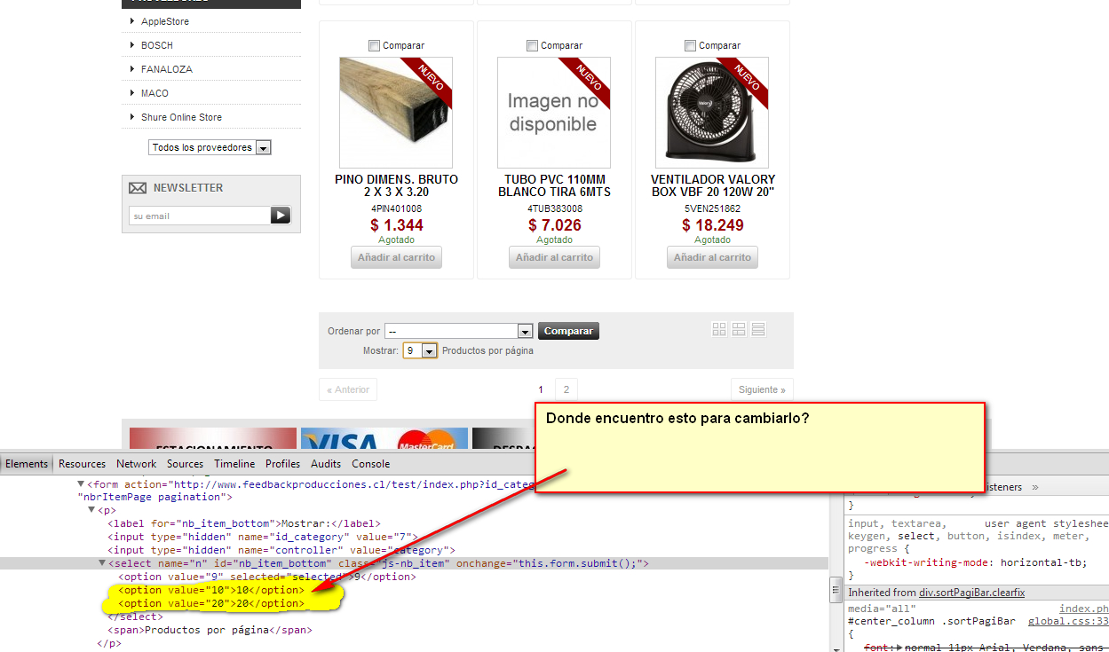 Daviant Posted December 15, 2013 Author Share Posted December 15, 2013 (PS 1.5.6.1 - Tema por defecto modificado) Tienda de Prueba Buenas noches/dias. No es muy descriptivo el titulo, pero en fin... no sabia como titularlo. Es un detalle lo que quiero hacer, pero no lo encuentro. Necesito cambiar la cantidad de productos que se muestran en pantalla, pero no la opción de Back Office -> Preferencias -> Productos. Esa ya sé modificarla, sino la que aparece en la captura, la desplegable. Puedo ver el código en Chrome, pero aun asi no se que archivo modificar, o no lo encuentro. El primer numero, el 9 es el del Back Office... los otros, el 10 y 20, que quiero ponerlos en 12 y 18 no los localizo... me gustaria saber como localizar el origen con el inspector del navegador... Gracias Alguien sabe de esto? ... Link to comment Share on other sites More sharing options...