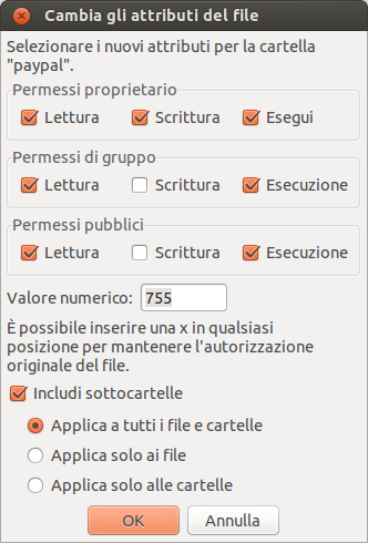 roro_1 Posted December 23, 2013 Author Share Posted December 23, 2013 Prova a dare permessi 755 o 775 alla cartella /modules/paypal come da screen allegato (io uso filezilla): permessi.png Ok e come faccio ad impostarli su un hosting come Register? Link to comment Share on other sites More sharing options...