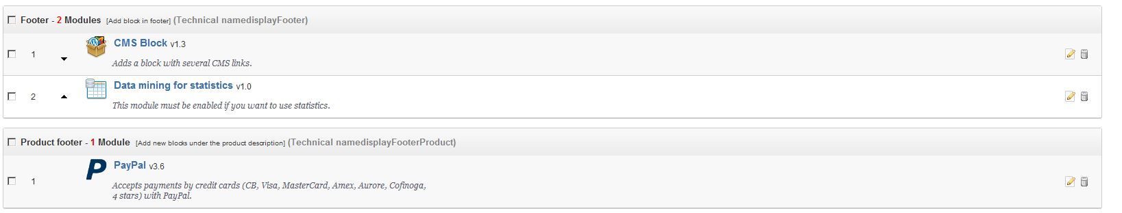 Bob-UK Posted December 16, 2013 Author Share Posted December 16, 2013 (edited) Okay - I think I follow: Footer - 2 Modules [Add block in footer] (Technical namedisplayFooter)1CMS Blockv1.3Adds a block with several CMS links. 2 Data mining for statisticsv1.0This module must be enabled if you want to use statistics. Edited December 16, 2013 by Bob-UK (see edit history) Link to comment Share on other sites More sharing options...