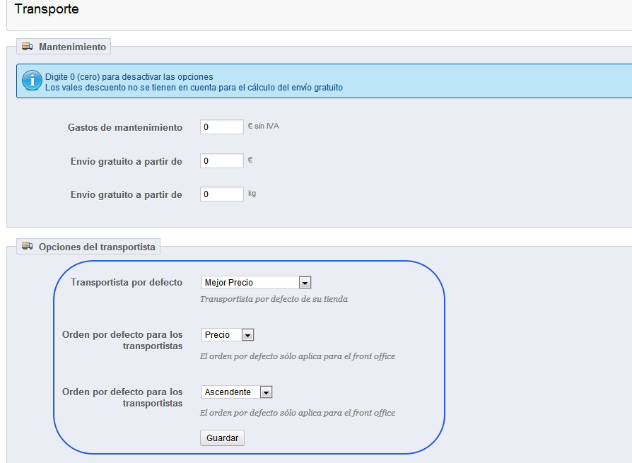 El orden lo puedes cambiar desde el menu transportistas, desde ahi tienes varias opciones de como configurar para que te salgan.