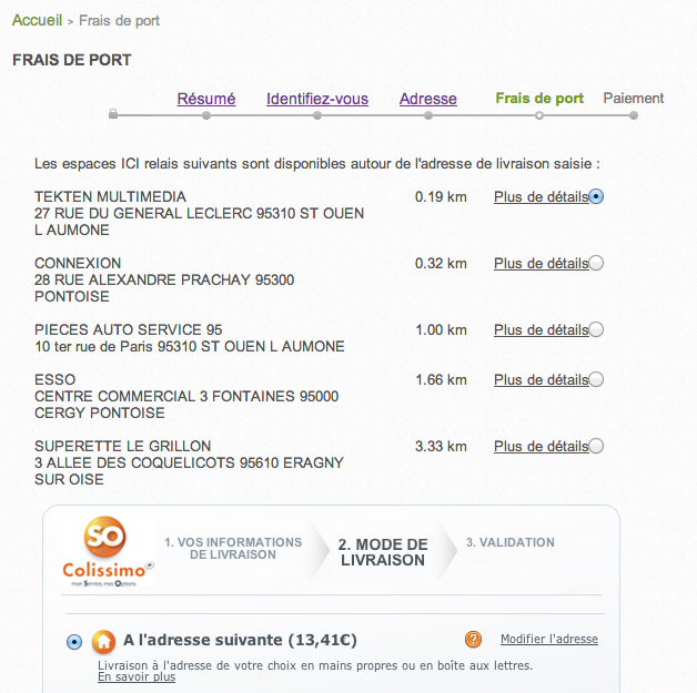 cfocket Posted December 16, 2013 Share Posted December 16, 2013 (edited) Bonjour, J'ai installé les modules Ici Relais et So Colissimo sur ma boutique. Le module ICI Relais interfère avec le module Colissimo lors du calcul des frais de port par Colissimo. En effet, au dessus de la boite de dialogue Colissimo apparait un récapitulatif des points ICI Relais disponibles au client. (voir img jointe) J'aimerais savoir si vous avez déjà rencontré ce problème et si vous avez pu trouver une solution. Merci d'avance, Clément. Edited December 16, 2013 by cfocket (see edit history) Link to comment Share on other sites More sharing options...