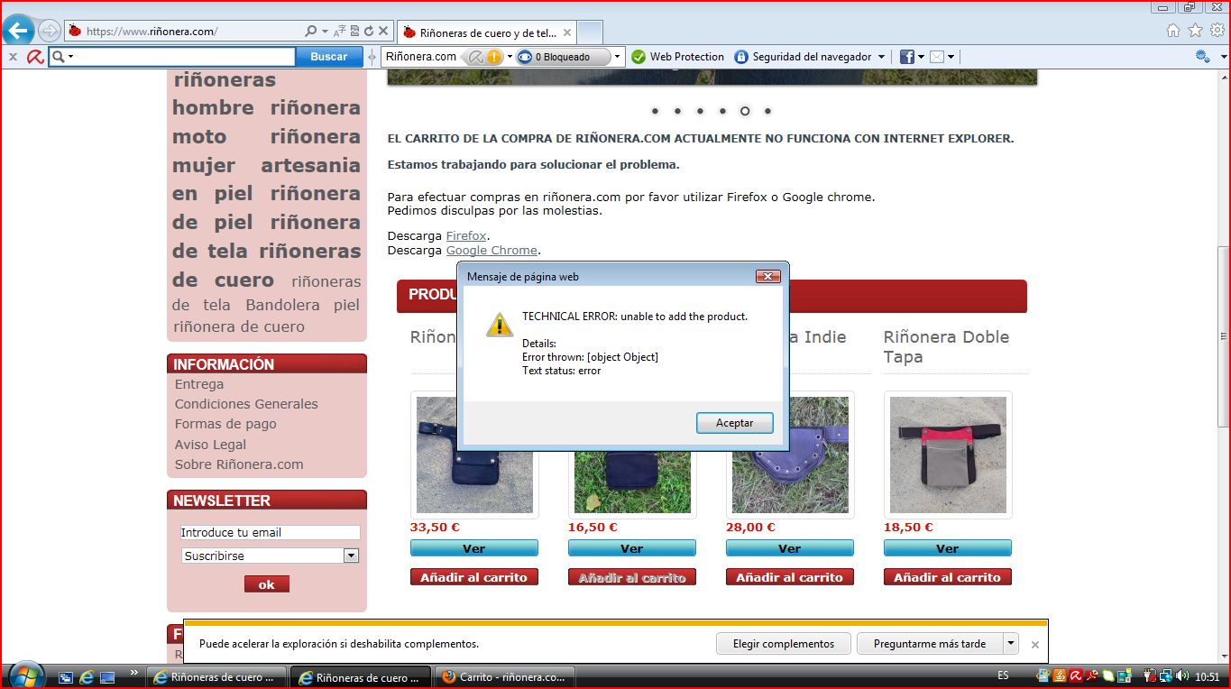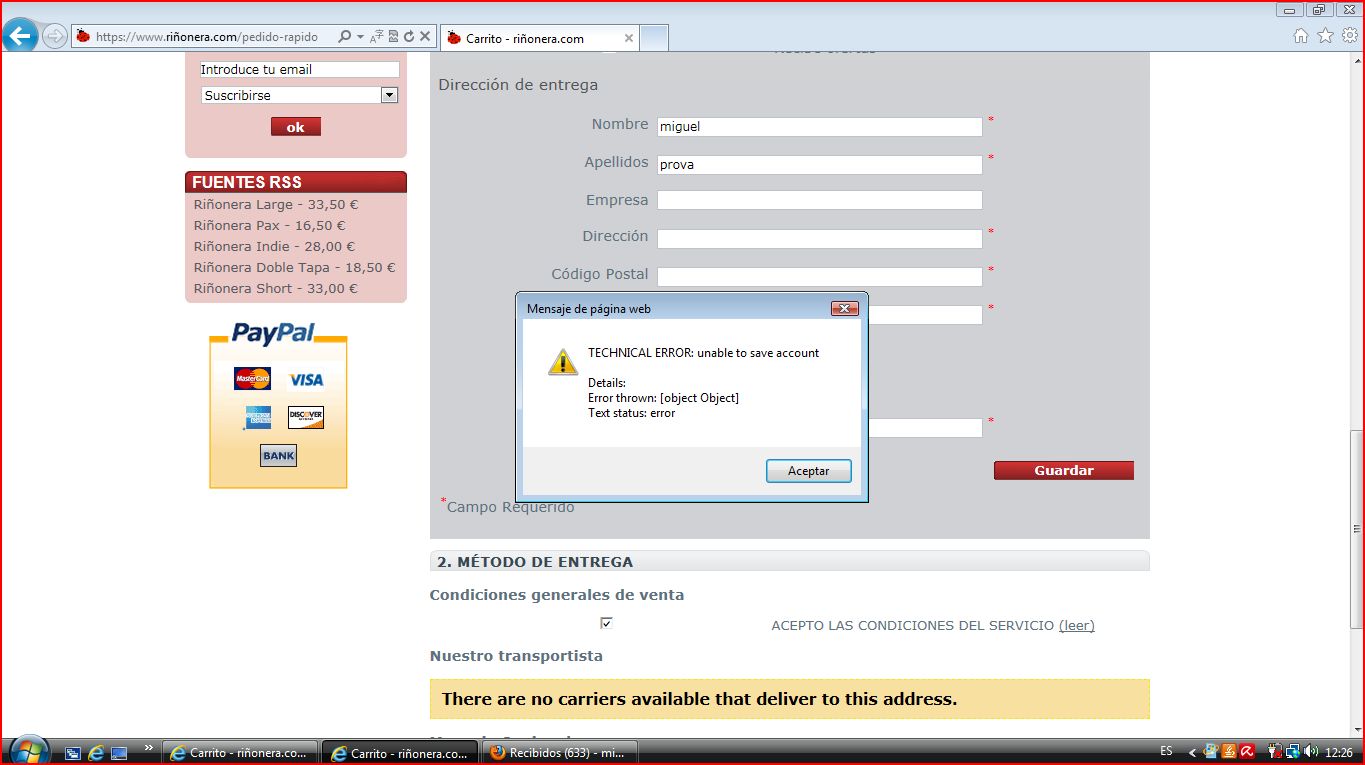 michelangelo Posted December 16, 2013 Share Posted December 16, 2013 (edited) Hola, despues de activar ssl en tienda online prestashop 1.4.11 (actualizada desde 1.4.8 manualmente), Internet Explorer bajo windows Vista y windows XP devuelve el siguiente error: TECHNICAL ERROR: Unable to add the product. Details: Error thrown: [object Object] Text Status Error. He leido muchos topics en el forum pero no he encontrado todavía solución. En todos los demás navegadores (Firefox, Chrome, Opera, Safari) todo funciona perfectamente, el error aparece solo en Internet Explorer 7, 8 y 9 instalado en windows XP y Windows Vista, en windows 7 y 8 todo funciona correctamente. Con carrito ajax habilitado, el error sale cuando se añade un producto al carrito. Adjunto pantallazo de error despues de añadir producto desde la home page : Pantallzo de error desde pagina producto: Con carrito ajax deshabilitado (modulo carrito 1.3), me permite añadir al carrito pero, en este caso, el error sale cuando guardo los datos personales antes de elegir el metodo de pago: TECHNICAL ERROR: unable to save account Details: Error thrown: [object Object] Text status: error Pantallazo de error con carrito ajax desactivado: Url de la tienda: http://www.xn--rionera-5za.com Alguna ayuda para corregir el error?Cordialmente. Edited December 16, 2013 by michelangelo (see edit history) Link to comment Share on other sites More sharing options...