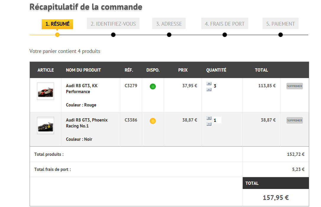 Denys06 Posted December 17, 2013 Share Posted December 17, 2013 (edited) Bonjour à tous, je poste ce topic car je fais face à un problème avec le panier de prestashop. J'ai actuellement adapté le code pour que dans mon panier les produits affichent une pastille de couleur selon la disponibilité du produit : Mon soucis est que pour le premier produit présent dans mon panier, il n'y a qu'un seul exemplaire en stock, hors ici en indiquant 3 dans la quantité souhaité, il indique toujours que le produit est en stock ce qui n'est pas correct vis-à-vis du client. J'aimerais que si le client indique une quantité au-dessus du stock disponible, que la pastille soit remplacé par une orange, ou bien encore mieux : que le produit soit dupliqué avec pour le premier une quantité de 1 en vert et le second une quantité de 2 en orange. Voici la ligne de code de mon fichier shopping-cart-product-line.tpl <td class="cart_ref" align="center"> {if $product.quantity_available > 0} <img src="{$img_dir}pr_avail.png" alt="{l s='Available'}" title="{l s='Available'}"> {else if $product.quantity_available <= 0 && $product.allow_oosp} <img src="{$img_dir}pr_preorder.png" alt="{l s='On Backorder'}" title="{l s='On Backorder'}"> {else if $product.quantity_available <= 0 && !$product.allow_oosp} <img src="{$img_dir}pr_oost.png" alt="{l s='Out of stock'}" title="{l s='Out of stock'}"> {/if} </td> Merci d'avance pour votre aide Edited December 17, 2013 by Denys06 (see edit history) Link to comment Share on other sites More sharing options...