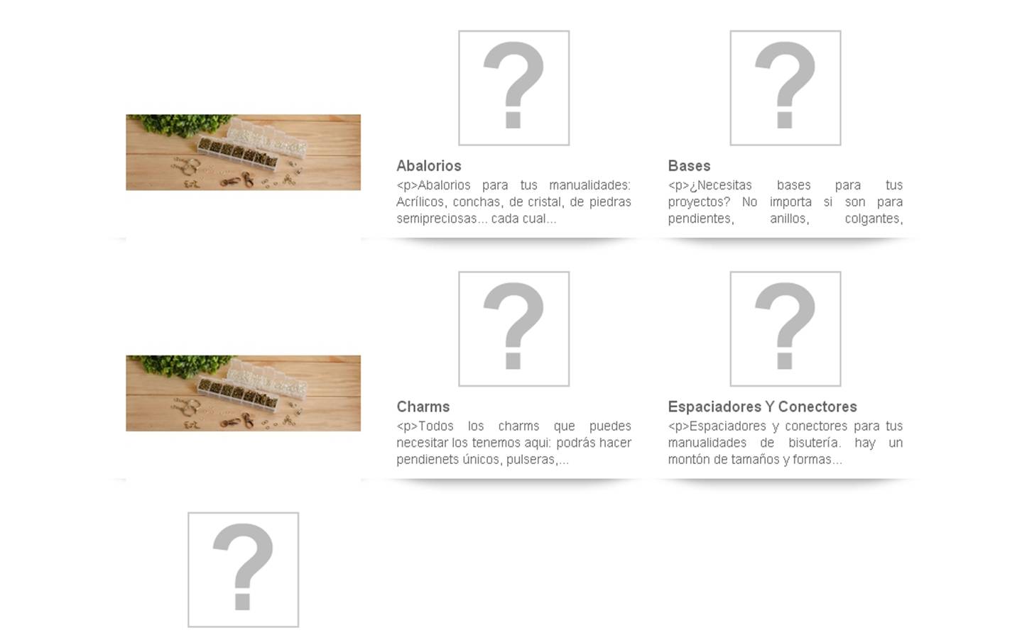 miamandarina Posted December 18, 2013 Share Posted December 18, 2013 (edited) Buenos días, Soy nueva en Prestashop y creando mi web (plantilla elation liquid) me he encontrado con un problema (en realidad dos problemas) a la hora de crear las categorías/subcategorías. 1. En la imagen adjunta se puede ver una de mis categorías, que está formada por 6 subcategorías. Hasta ahora había metido solamente la descripción, que ya para empezar se me ve con la etiqueta de <p> delante, no sé por qué. El caso es que hoy me he puesto a subir las imágenes para cada subcategoría (al tamaño 960x300 que es lo que recomienda la plantilla que tengo) y al subirlas la descripción de la subcategoría desaparece; en la imagen adjunta podéis ver que he subido dos imagenes de prueba en dos de las subcategorías y el texto que había ya no aparece. ¿Cómo puedo solucionarlo? 2. Por otra parte, si incluyo una imagen para una subcategoría, al abrir dicha subcategoría esta imagen me aparece en grande en la parte de arriba; me gustaría que esto no apareciese pero no sé como hacer. He visto por foros que hay que poner en category.css lo siguiente: #category img#categoryImage margin-top: 1em; display:none; Pero en mi archivo category.css no encuentro nada parecido (adjunto el archivo también). Muchas gracias por la ayuda. category.css Edited December 18, 2013 by miamandarina (see edit history) Link to comment Share on other sites More sharing options...