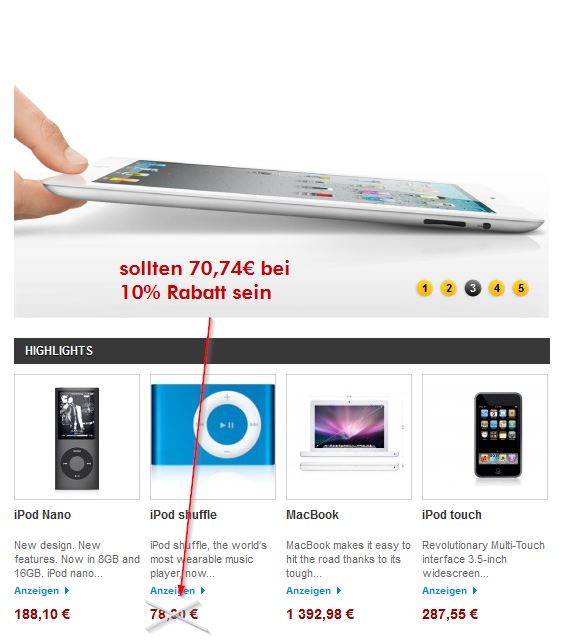 Gurkcity Posted December 20, 2013 Share Posted December 20, 2013 Es gibt verschiedene Ebenen, wo der Rabatt angezeigt wird: Startseite Kategorieseite Produktdetailseite Warenkorb Der Rabatt, der unter Kunden > Gruppen > Gruppe bearbeiten > Rabatt (in%) eingestellt wird, wird scheinbar nicht überall gleich angezeigt. z.B. auf der Startseite (Modul homefeatured / Highlights) wird dieser Rabatt ignoriert. Auf der Kategorie- und Produktseite wird der Endpreis korrekt dargestellt. Im Mini-Warenkorb und auf der Bestellübersicht sieht es auch gut aus. Wo wurde der Rabatt eingestellt? Link to comment Share on other sites More sharing options...