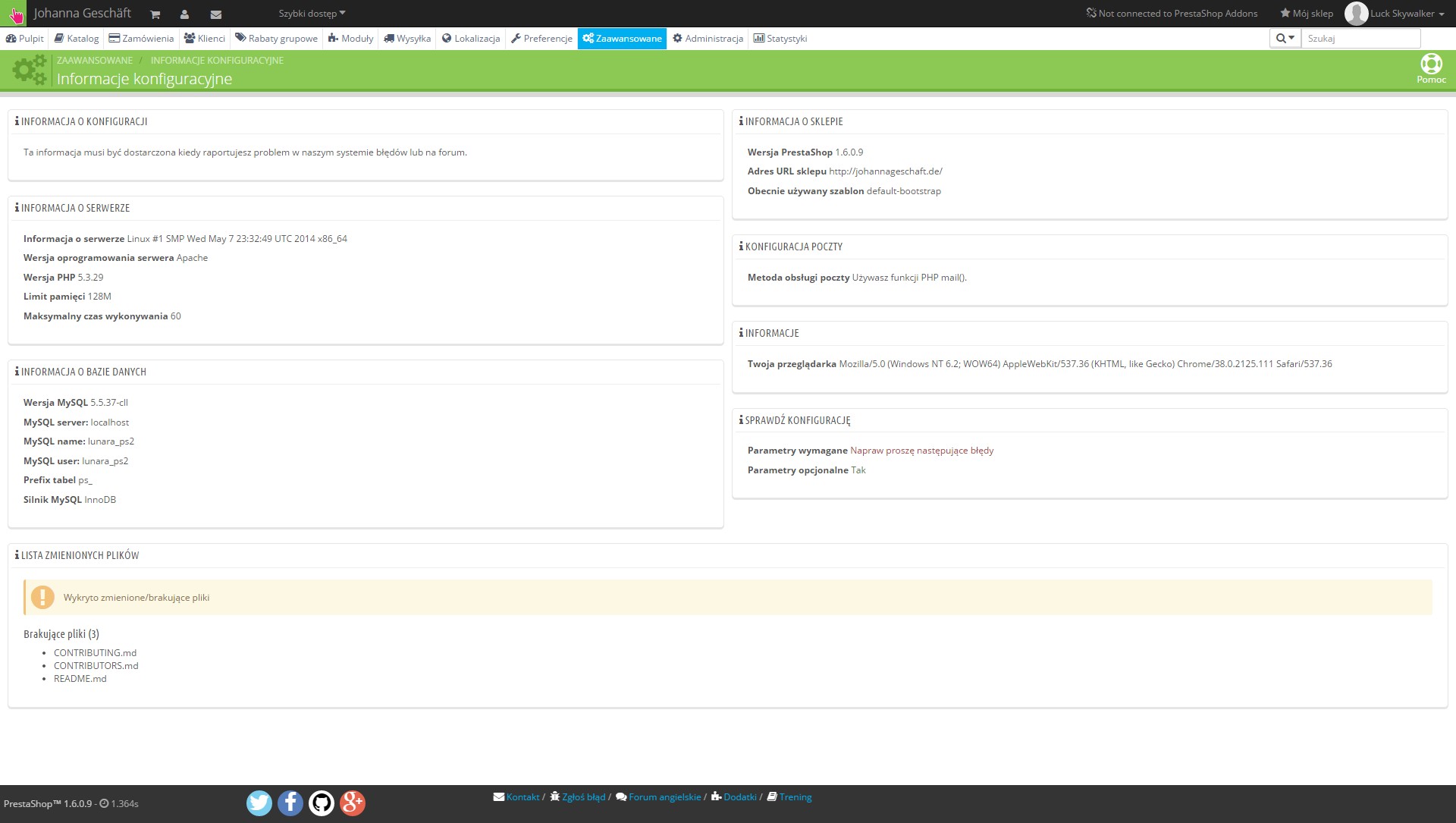 Davidmax Posted December 19, 2013 Share Posted December 19, 2013 (edited) Witam ! Jak mogę sprawdzić co mam naprawić w konfiguracji sklepu. wszystko było OK. Dziś zaglądam i jest czerwono: Parametry wymagane: Napraw proszę następujące błędy tylko że nie ma żadnej informacji co naprawić ? od czego zacząć ? Help ! Informacja o serwerze Informacja o serwerze: Linux #1 SMP Tue Apr 17 23:56:34 BST 2012 x86_64 Wersja oprogramowania serwera: Apache Wersja PHP: 5.2.17 Limit pamięci: 128M Maksymalny czas wykonywania: 120 Informacja o bazie danych Wersja MySQL: 5.1.72-cll Silnik MySQL: MyISAM Prefiks tabel: ps_ Informacja o sklepie Wersja PrestaShop: 1.5.6.1 URL sklepu: http://naughtystore.es/ Obecnie używany szablon: toplingerie Konfiguracja poczty Metoda obsługi poczty: Używasz funkcji PHP mail(). Informacje Twoja przeglądarka: Mozilla/5.0 (Windows NT 6.1; rv:25.0) Gecko/20100101 Firefox/25.0 Sprawdź konfigurację Parametry wymagane: Napraw proszę następujące błędy Parametry opcjonalne: OK Edited December 19, 2013 by Davidmax (see edit history) Link to comment Share on other sites More sharing options...