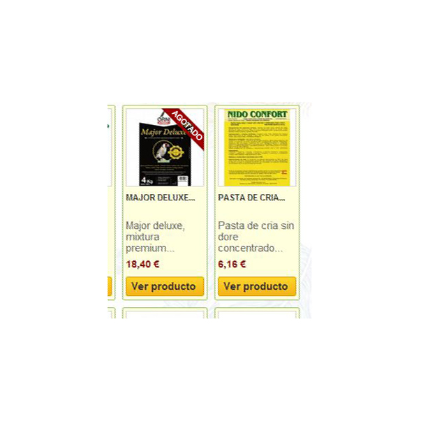Akthon Posted December 20, 2013 Share Posted December 20, 2013 (edited) Resulta que en mi web estan los articulos de forma visual en grid y claro no se ve si hay stock o no hasta que entras en cada articulo y entonces queria saber si se puede poner como en la imagen que adjunto , mi web es www.todoave.es, en la imagen que adjunto se ve como una banda sobre la imagen que pone agotado, y eso es lo me que me gustaria añadir a mi web, de forma que los usuarios no tengan que entrar en cada producto para saber si esta disponible o no, y asi hacer mas agiles las compras de los clientes. un saludo Edited December 22, 2013 by Akthon (see edit history) Link to comment Share on other sites More sharing options...