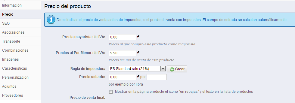 Feliz Garcia Posted December 23, 2013 Share Posted December 23, 2013 (edited) A mi me paso una vez algo parecido, y era por que no me aparecia el campo para añadir el precio con IVA, cosa que veo que a ti tampoco te aparece, en mi caso que no quiere decir que sea el tuyo, fui a la pestaña Localización -> Paises -> Edite el pais España y la opción llamada: Mostrar la etiqueta de impuestos (por ejemplo, "IVA incl.") la tenia en NO y señale que SI (No te dije en la traducción de la opción que no es muy agraciada y puede conllevar confusiones) Edited December 23, 2013 by Feliz Garcia (see edit history) Link to comment Share on other sites More sharing options...