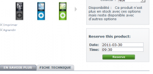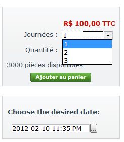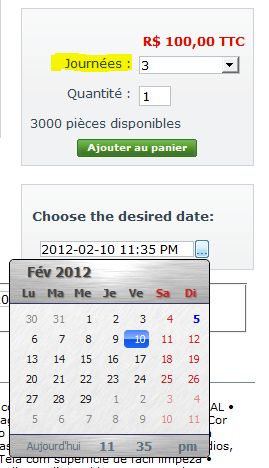 yvesbj Posted March 28, 2011 Share Posted March 28, 2011 Génial, ça se rapproche grave de ce que je souhaite !Est-il possible de faire comme sur le visuel ci-joint ?Il ne doit pas y avoir de bouton "reserve", les dates doivent être prisent en compte lorsque l'on clique sur "ajouter au panier" (que l'on peut renommer après...). Les informations sur les dates sont ainsi reçu avec la commande.La par exemple avec ton module actuel, je ne sais pas ou voir la date.Si on peut faire ça c'est avec plaisir que je te ferais un don généreux ! Donne moi d'ailleurs ton paypal si tu en as un. Link to comment Share on other sites More sharing options...