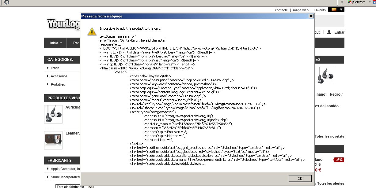 yaargle Posted March 3, 2014 Author Share Posted March 3, 2014 hello,, I still have problem on IE browser. Impossible to add product to cart (if I remove ajax cart its works on IE) but then on IE impossible to register, add adress.... always Parseerror = invalid caracter I ve made fresh install, diable, paypal, test install back to one language, runnnig now 1.6.2, disabled mobile theme, make sure no accents in product title... Only solution so far, ask client to use CHROME or Firefox and NOT use IE but not very good solution Clue; seems to have started when I started using 'adbanced stock management' website is at www.galaxykayaks.eu running 1.6.2, / 2 languages, / customized theme but no big changes, Please help, been weeks with problem and can't find a decent solution. nico Link to comment Share on other sites More sharing options...
