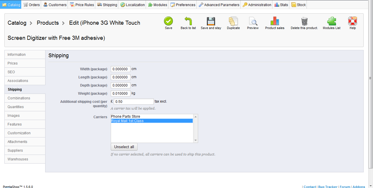 webgace Posted January 14, 2014 Share Posted January 14, 2014 Hi Tony Thanks a bunch Before you sent it I had a remedy by disabling the option 'Enable Stock Management' and ; Enable advance-stock management' under 'Preference --> Products Will apply your suggestion and so I have the stock option fully working Again, thank you for your help. It has been greatly appreciated Antonio Enable advanced-stock management Yes NoAllows you to manage physical stock, warehouses and supply orders. Hi Antonio, Just read your comment. Don't know if you fix it yet, but here are my suggestions: 1. Enable the carrier(s) in the product; 2. Enable the carrier(s) in the Carriers under Shipping tab; 3. Enable the carrier(s) in the warehouse under Stock tab; 4. Check if the carrier(s) is being connected to the country or zone. It should work if you follow above steps. Hope it helps. Tony Link to comment Share on other sites More sharing options...