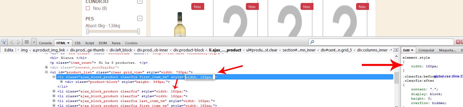 JordiRC Posted December 30, 2013 Share Posted December 30, 2013 ¡Hola! Quiero que los productos se vean en 3 columnas en vez de 4 como lo tengo ahora. He estado revisando los foros pero no me aclaro. Veo que hay una línea de código que creo que es la que no me deja hacerlo, ya que es un style inline de ancho que se crea automáticamente y no sé dónde se crea. Este ancho (182px) hace que el ancho que pongo en el CSS no sea válido. Me imagino que es algo del archivo product-list.tpl Os dejo una captura. Muchas gracias Link to comment Share on other sites More sharing options...