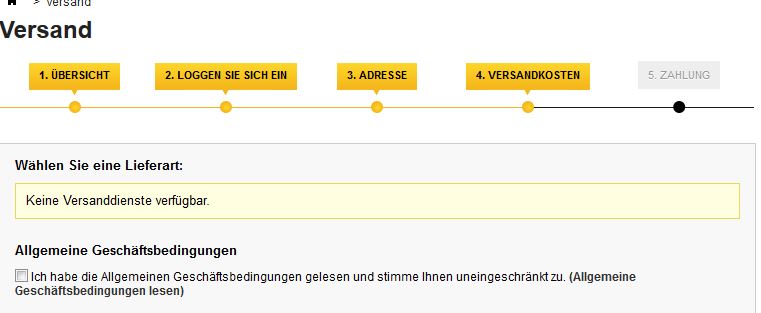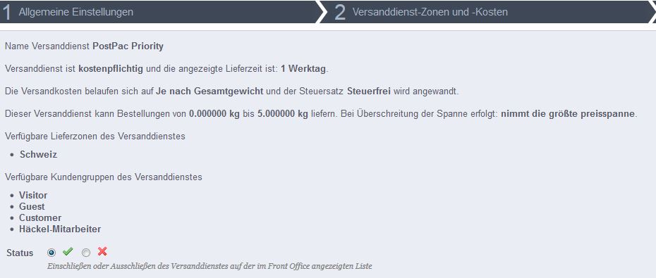 BreSHi Posted January 2, 2014 Share Posted January 2, 2014 (edited) Hallo Community, habe ein weiteres Problem. Nach 6 Stunden probieren und suchen habe ich aufgegeben und hoffe ihr könnt mir da weiterhelfen. Unter Lokalisierung habe eine neue Zone erstellt: Schweiz, unter Länder habe ich die Schweiz in die Zone Schweiz zugewiesen. Die Zone wie auch das Land ist aktiv. Unter Versanddienste habe ich einen neuen Versand erstellt: PostPac Priority. Dann jeweils alles ausgefüllt (Alle Schritte in ScreenShots). Auch wenn ich alles Zonen auswähle ist dan bei der Bestellung kein Versanddienst Verfügbar. Woran liegts? Habe wirklich alles versucht. Bei den Produkten ist der Versanddienst ausgewählt und überschreitet die Masse nicht. Ich danke schon im Vorraus Das BreSHi-Team Edited January 2, 2014 by BreSHi (see edit history) Link to comment Share on other sites More sharing options...