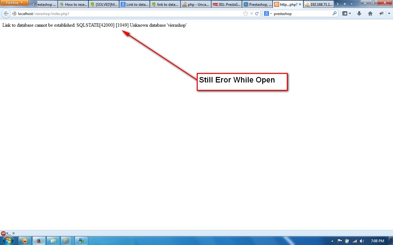 z4cky87 Posted January 3, 2014 Share Posted January 3, 2014 Hi,Master Prestashop,Please Help Me, I opening my web appear eror" ,Link to database cannot be established: SQLSTATE[42000] [1049] Unknown database 'vierashop' ",where ,I make new webserver to use with os ubuntu in the vmware ,but while open eror ,before the old server localhost and use "phpmyadmin with username:root and password "" and on the new server to use phpmyadmin with username "root" and password "12345678" i have to change setting.inc.php on the folder confid,but still eror. More detail can to look the image is bellow Link to comment Share on other sites More sharing options...