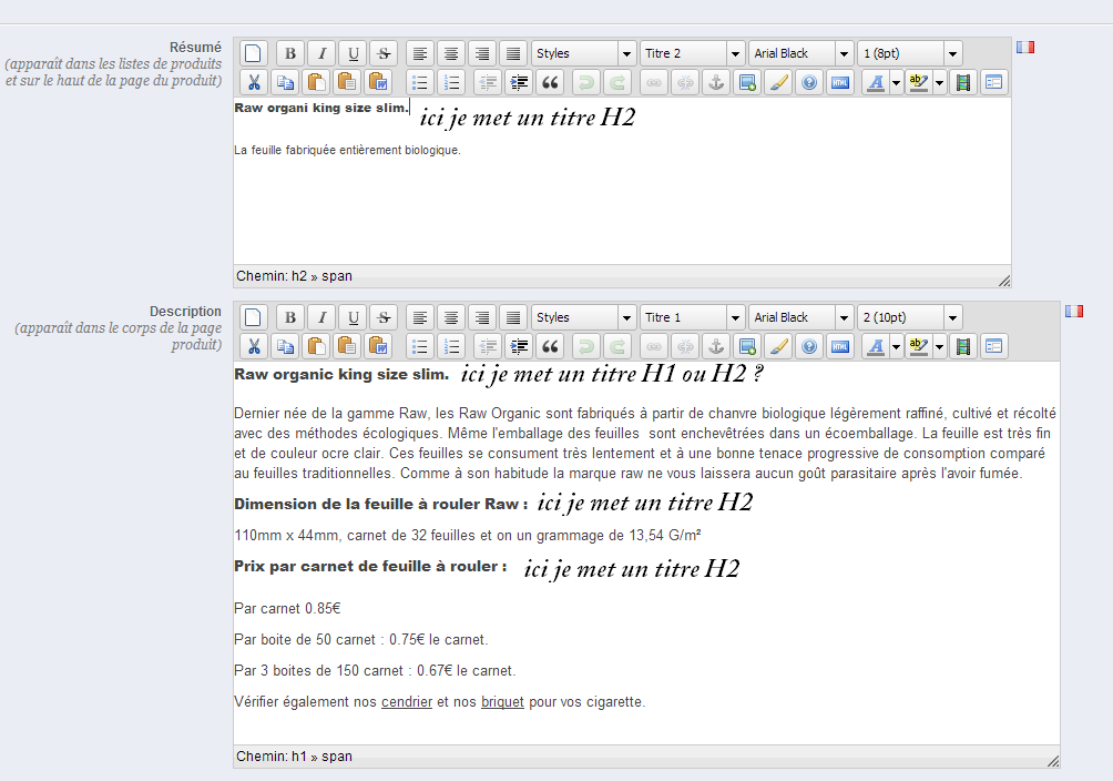johnny1981 Posted January 4, 2014 Share Posted January 4, 2014 Bonjour, Occupé avec le référencement de mon site j'attaque les balise H. Pour sa j'ai pris screaming frog seo spider et search engine optimization de microsoft. Maintenant j'ai un conflit en screaming frog seo spider il me dit que j'ai deux balise H1 ( je suppose tilte et le H1 que je met) et dans search engine optization de microsoft il me marque que j'ai aucune balise H1(quand je met mon premier titre de description en H1) voir image) Quelle est la bonne solution pour mettre les balise H1. Aussi mon site est très lent vérifier par vous même, www.smokeshopbelgium.be quelle qu'un pourrais me dire quelle module installer qui pourrais éviter cette lenteur ? point google web master 55/100 mobile et 63/100 web alors que j'ai acheter un thème responsive. Aussi une question à l'achat de mon thème il est marqué fonctionnalité rich snippets dans la description du thème (voir photo) mais aucun fonctionnalité est activer faut t'il l'activé quelle que part d'autres (pas de module dispo) aussi aucun code des rich snippets est présent dans les html. C'est de l'arnaque ou ... ? Link to comment Share on other sites More sharing options...
